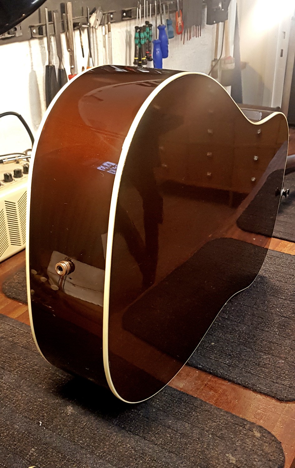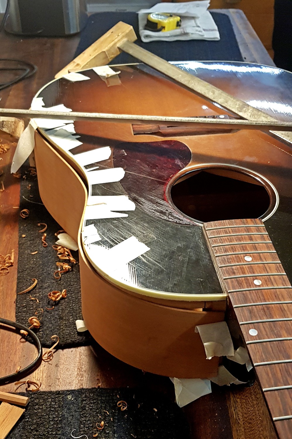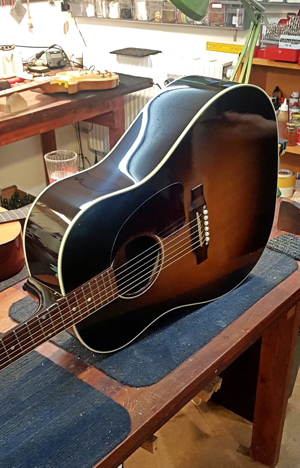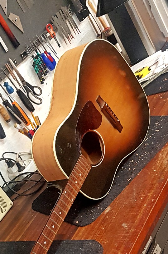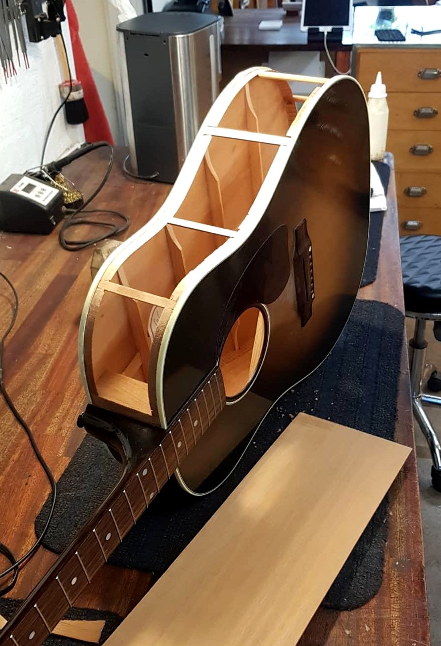 Gibson J-45 sargbyte – Denna J-45 såg rätt hopplös ut när den kom till oss, men se på resultatet! Som ny. Med försäkringsbolagets hjälp var det även en ekonomiskt smärtfritt reparation, en mycket nöjd kund fick sin favoritgitarr tillbaka. Hela sargen togs bort och ersatten med en ny av samma material. Med hjälp av stödribbor var det möjligt att limma den nya sargen med precision och efter lackering med nitrocelluilosa i samma kulör går det inte att säga vilken sida som är bytt. Se processen på bilderna. Arbetet utfört av Ludvig Holgersson.