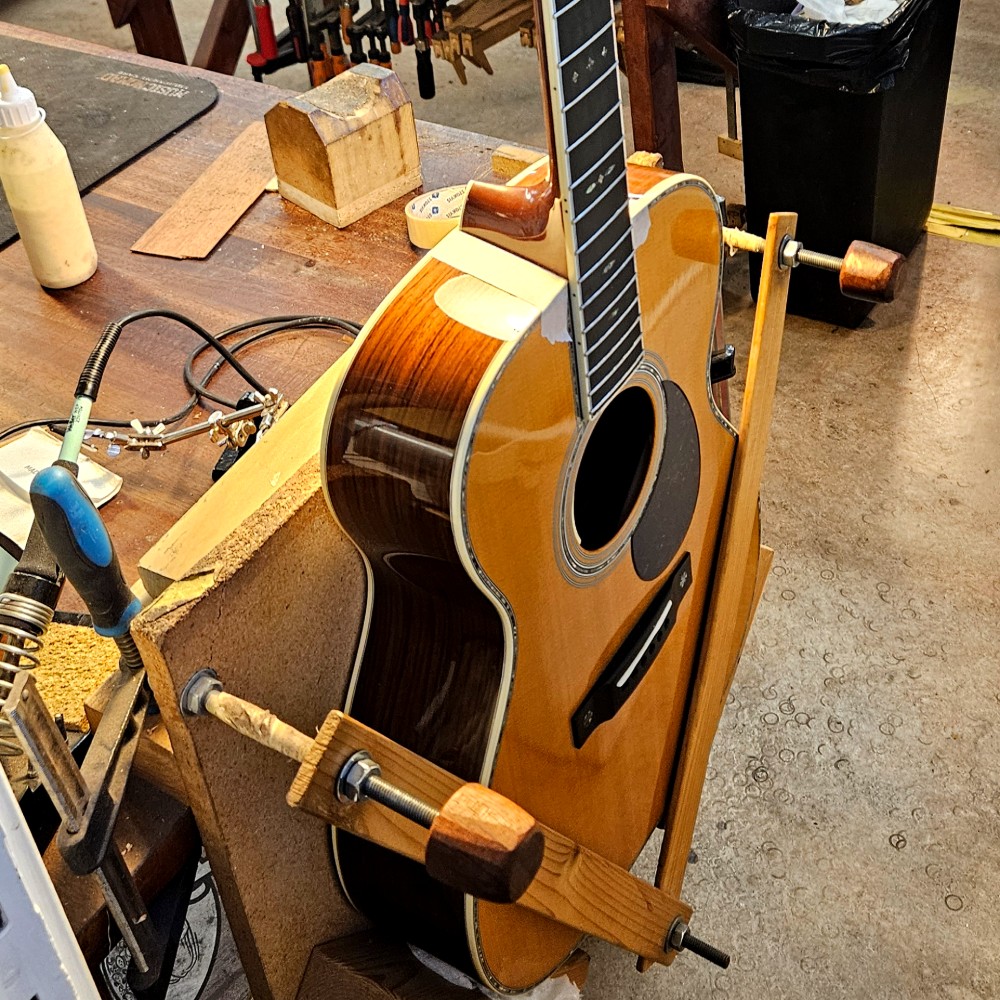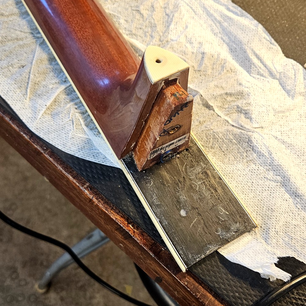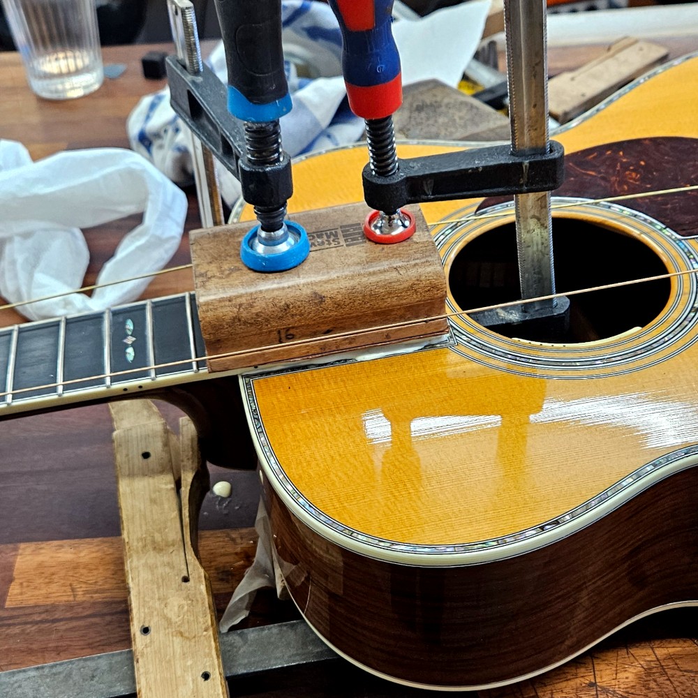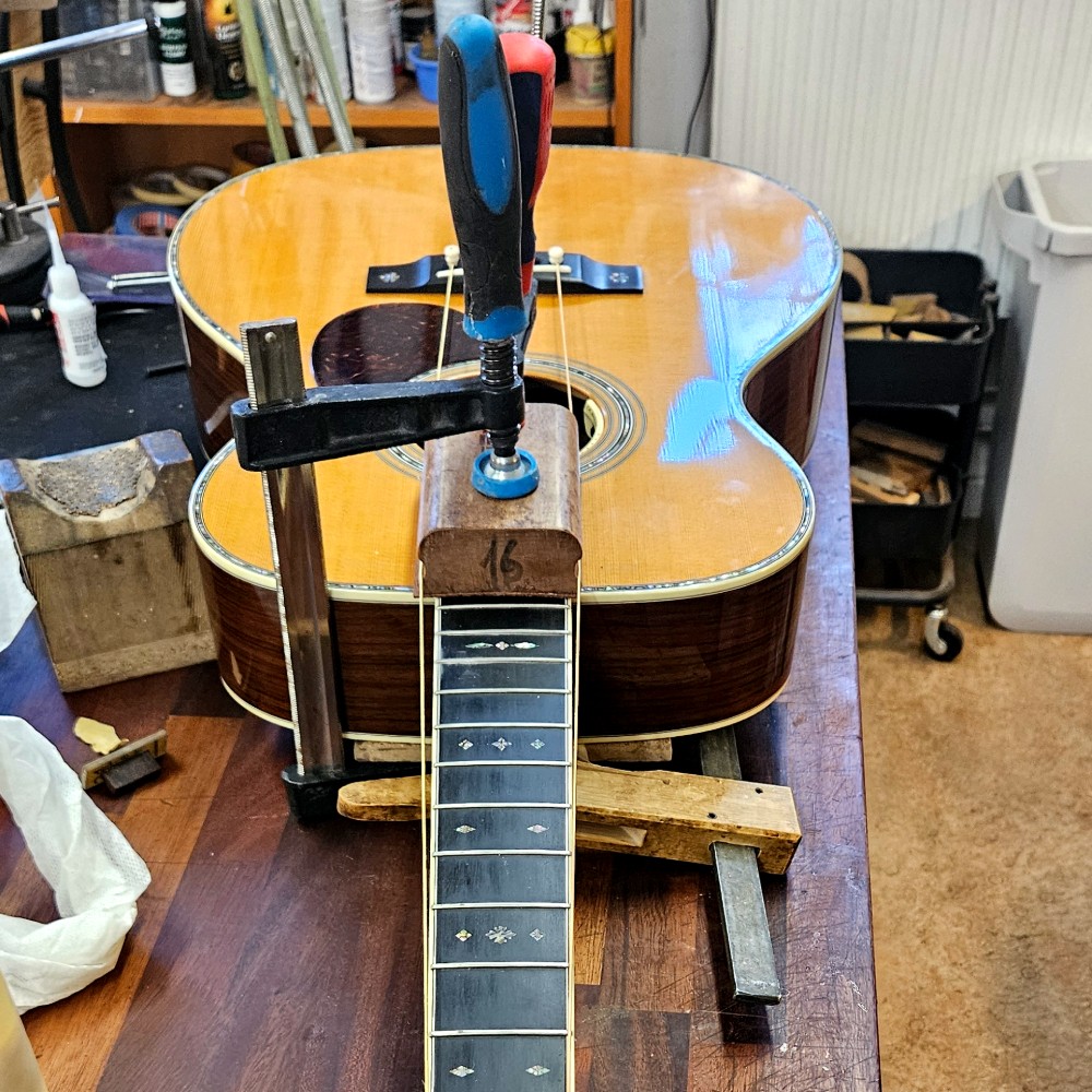 Halsens riktning kontrolleras med provsträngar både i sid- och höjdled, och när allt stämmer, limmas halsfästet och greppbrädan på locket tillbaka samtidigt. Halsen passas exakt, så dovetailtappen nyper den fast precis när den glider på sin plats (dovetail heter laxstjärt på svenska!). Det behövs därför inga stora krafter vid limningen. De två provsträngarna håller halsen mot kroppen, en träkloss håller greppbrädan mot locket och en lång trätving hållar halsklacken mot sargen medan limmet torkar. Nästa dag lossas dessa, eventuella limrester tas bort och gitarren är klar för uppsträngning och justering. En ny stallsadel behövs och vi håller uppsikt över gitarren de första timmarna efter uppsträngning.
