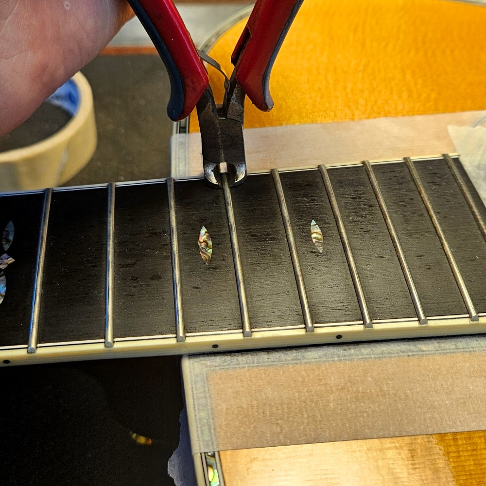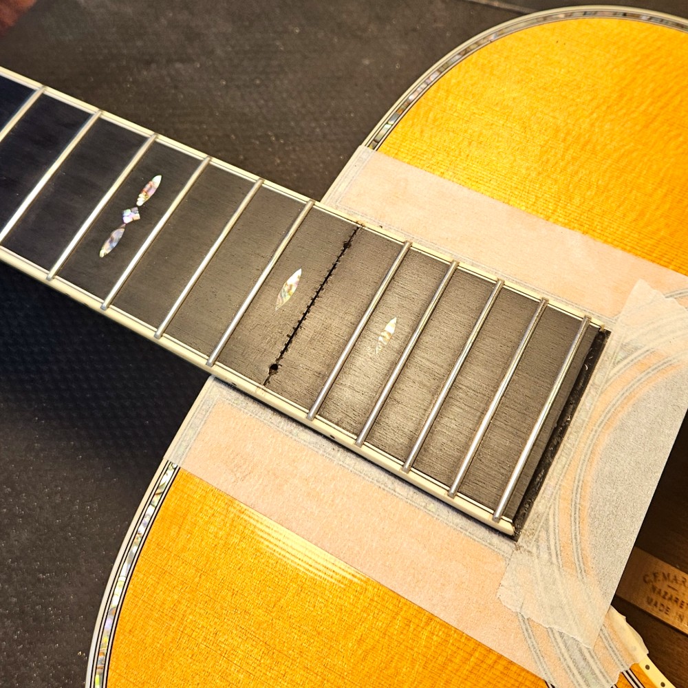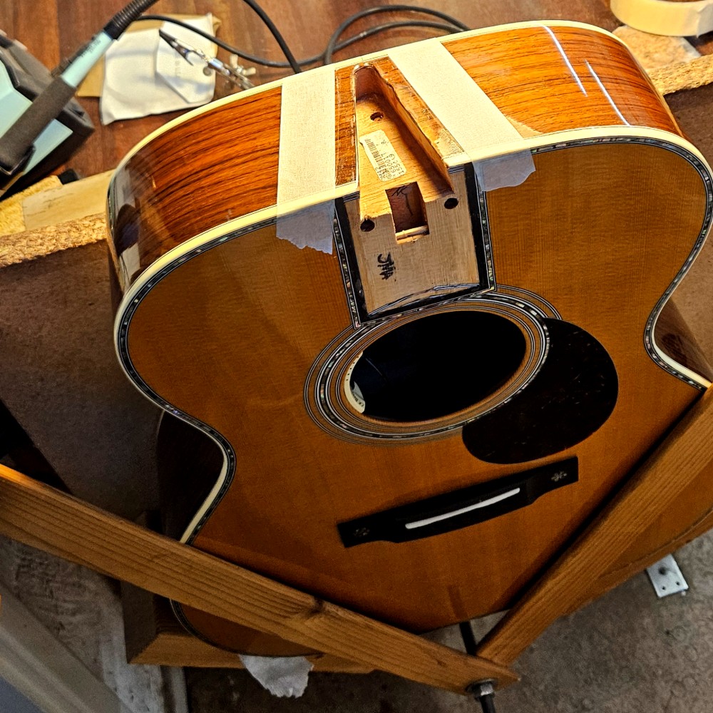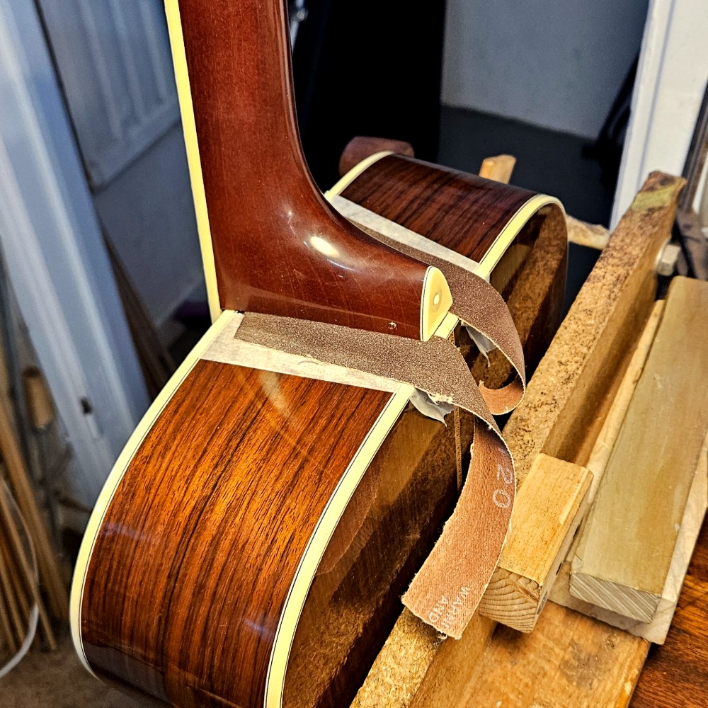 Halsens riktning kontrolleras med provsträngar både i sid- och höjdled, och när allt stämmer, limmas halsfästet och greppbrädan på locket tillbaka samtidigt. Halsen passas exakt, så dovetailtappen nyper den fast precis när den glider på sin plats (dovetail heter laxstjärt på svenska!). Det behövs därför inga stora krafter vid limningen. De två provsträngarna håller halsen mot kroppen, en träkloss håller greppbrädan mot locket och en lång trätving hållar halsklacken mot sargen medan limmet torkar. Nästa dag lossas dessa, eventuella limrester tas bort och gitarren är klar för uppsträngning och justering. En ny stallsadel behövs och vi håller uppsikt över gitarren de första timmarna efter uppsträngning.
