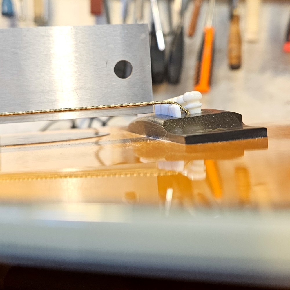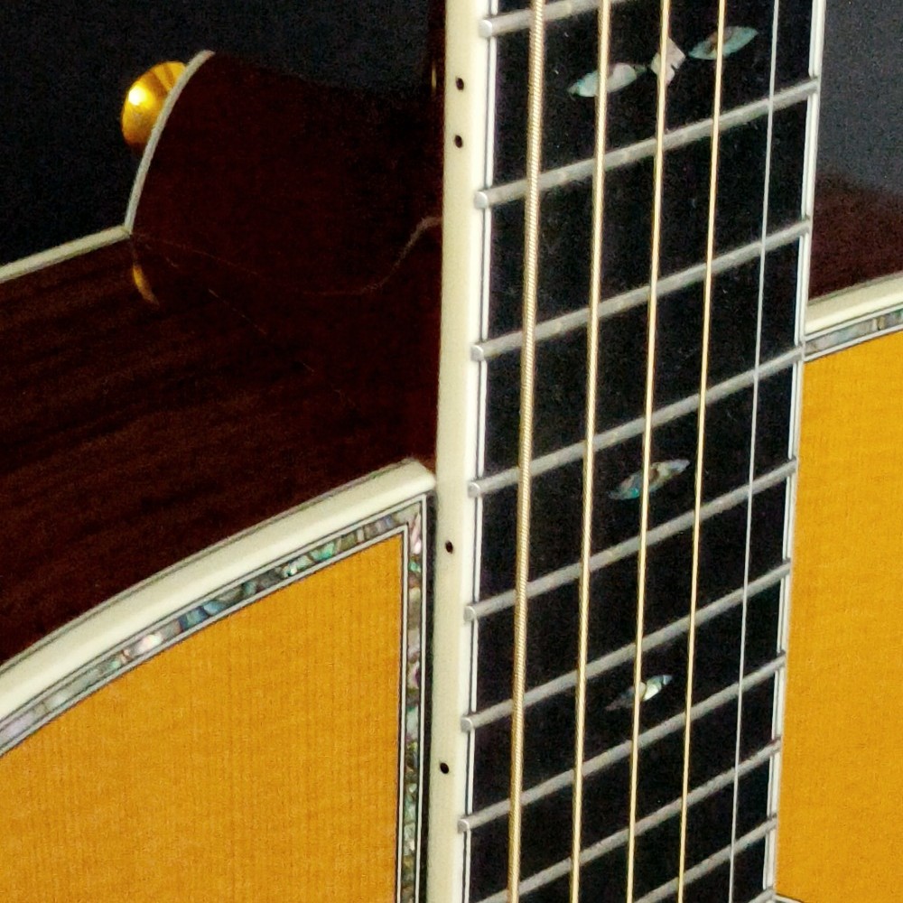 Om man lägger en lång linjal på halsen av en ny akustisk gitarr som är korrekt stämd och injusterad, ska linjalen peka på, eller något över stallets träyta. Det är många saker som påverkar detta så variationen som är godtagbar är ca +/- 1 mm. På den här gitarren pekade linjalen ca 2 mm under stallets yta och gitarren hade därför ganska hög stränghöjd med en väldigt låg stallsadel. För att åtgärda detta gjorde vi en halsomsättning (Neck reset på engelska) som går till så här: