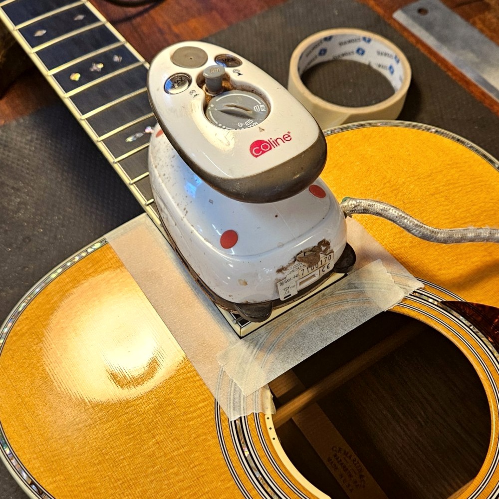 15:e bandstaven tas bort för att kunna borra hål genom bandskåran ner till halsens dovetailfäste. Två långa hål borras som möts vid dovetail-tappens nedre spets. Greppbrädan lossas från locket genom värmning, och sedan sprutas ånga genom de två långa hålen för att värma loss limmet i hela halsfästet. Med hjälp av den speciella anordningen som trycker halsklacken uppåt från halsfästet lossas halsen från kroppen. Sedan slipas halsens anliggningsyta om, så att halsen pekar ca 1 mm över stallets yta. Dovtailfästet blir glappt när man gör detta, så det läggs in mahognybitar för att fylla upp glipan.