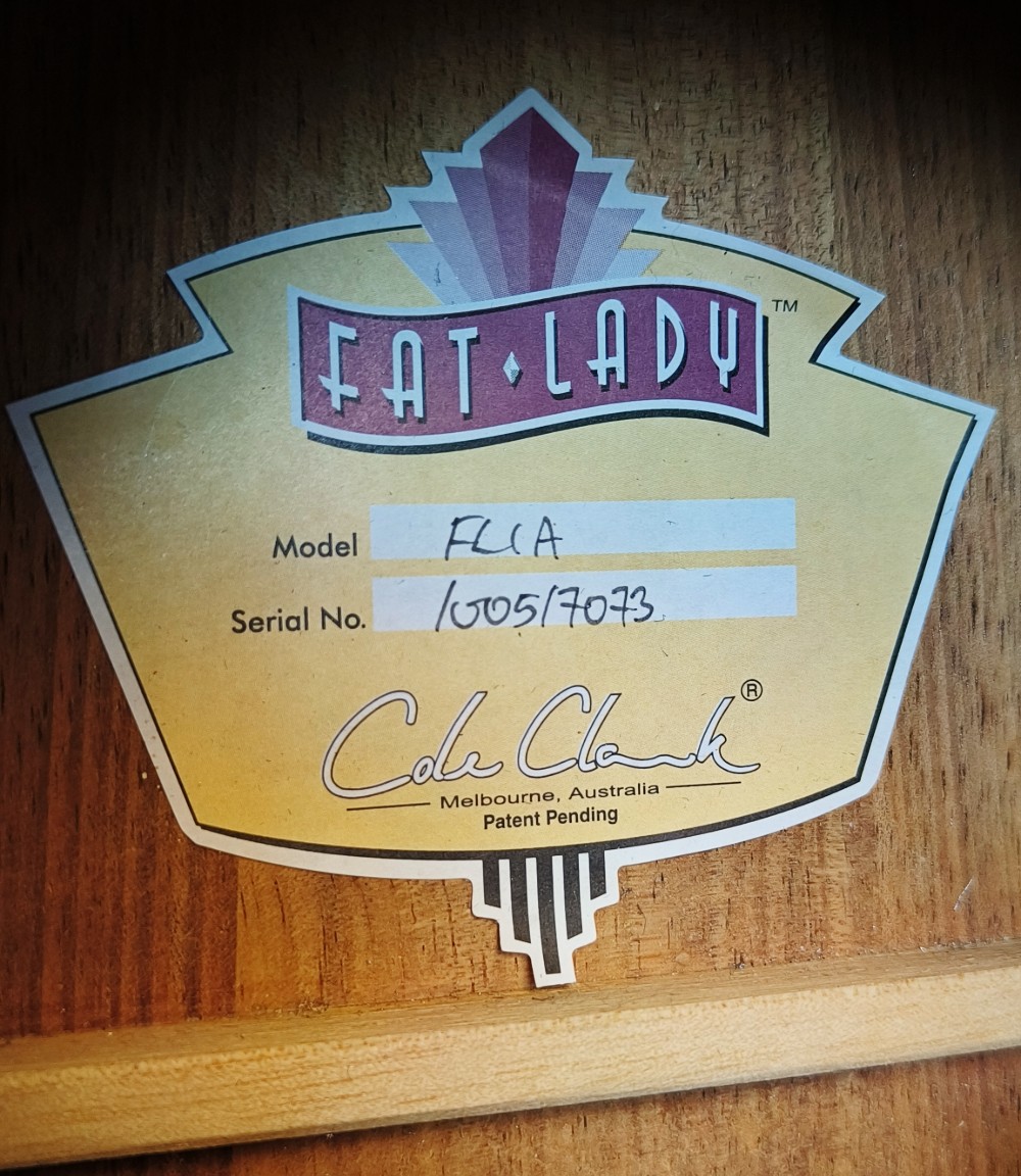 Cole Clark Fat Lady 1A tillverkad maj 2010. Dessa är är de enda stålsträngade gitarrer med Spanish heel, d.v.s. halsen och halsklacken är samma stycke trä, så locket sargen och bakstycket är limmat direkt på samma träbit som fortsätter som hals utanför kroppen. De är byggda i Melbourne, Australien och är gjorda av inhemsk virke där. Gitarren är nyligen bandslipad och justerad, spelar och låter mycket bra. Levereras i hårt originaletui med Humitron luftfuktare. Specifikationerna är som följer: