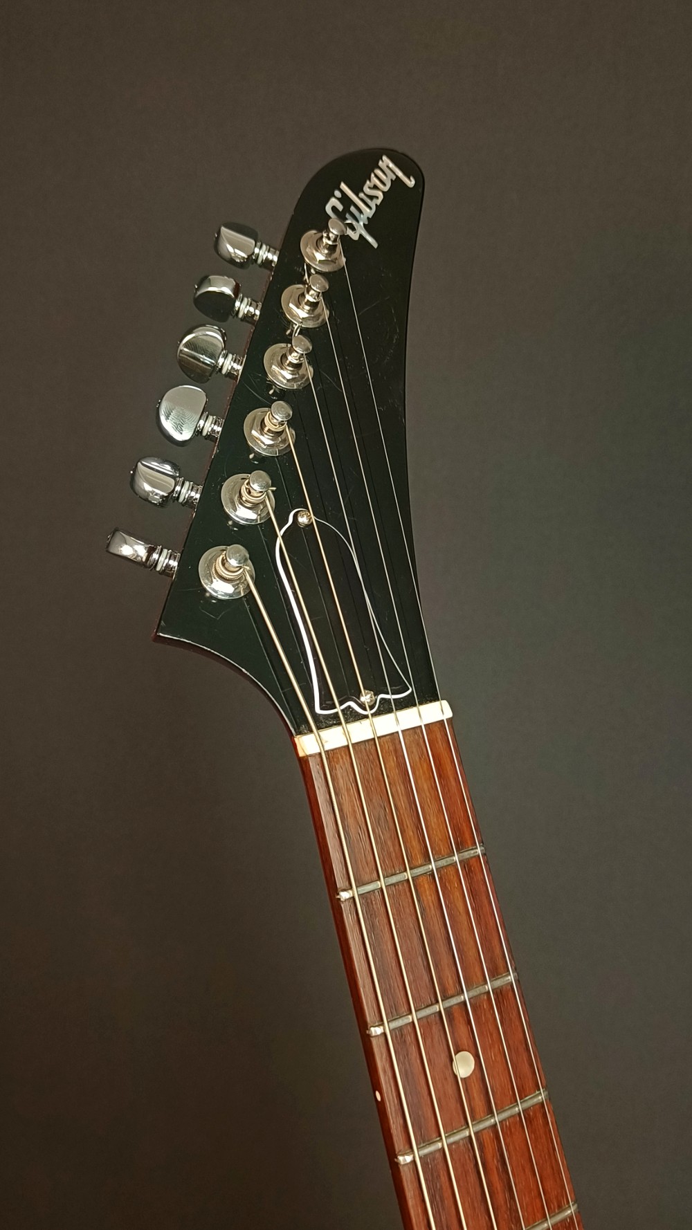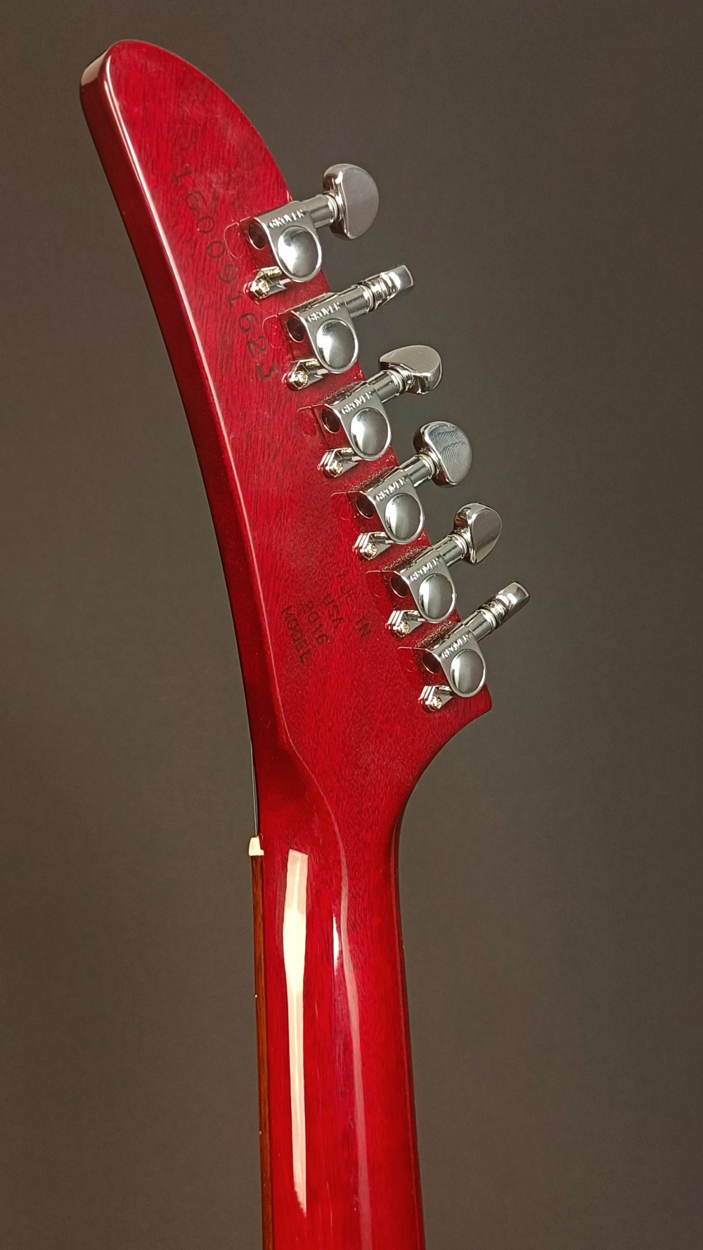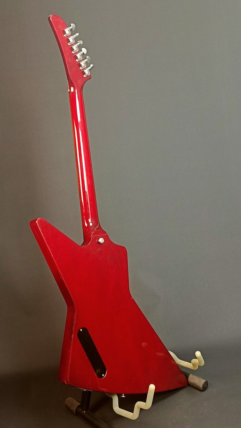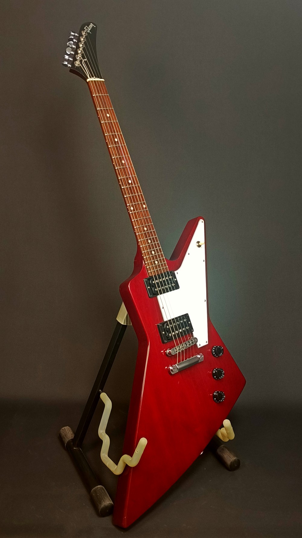 Gibson Explorer från 2016. Trots sitt tuffa utseende är detta en mycket följsam gitarr med mjuk varm och behaglig ton. En fröjd att spela, även om du behöver bra axelband, för det är svårt att sitta med den och den passar inte så bra i gitarrställ heller, som du kan se på bilderna. Något sliten i lacken med en del repor och märken, men helhetsintrycket är ändå väldigt trevligt. Det är ett mycket bra, välfungerande instrument, med höga, fina bandstavar, rak hals och låg vikt på 3620 gram. En potentiometer är utbytt, men följer med, i övrigt är alla delar original. Gibson 496R i halsläget och 500T i stalläget. Gitarren levereras i ett hårt etui som inte är original, som du kan se på bilden. De såldes nya med gigbag.