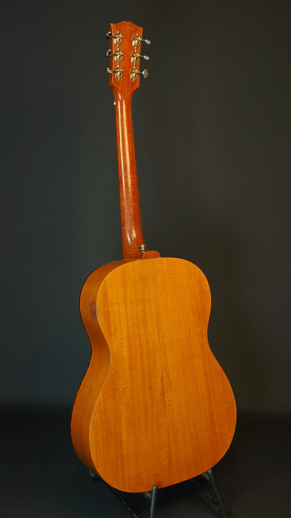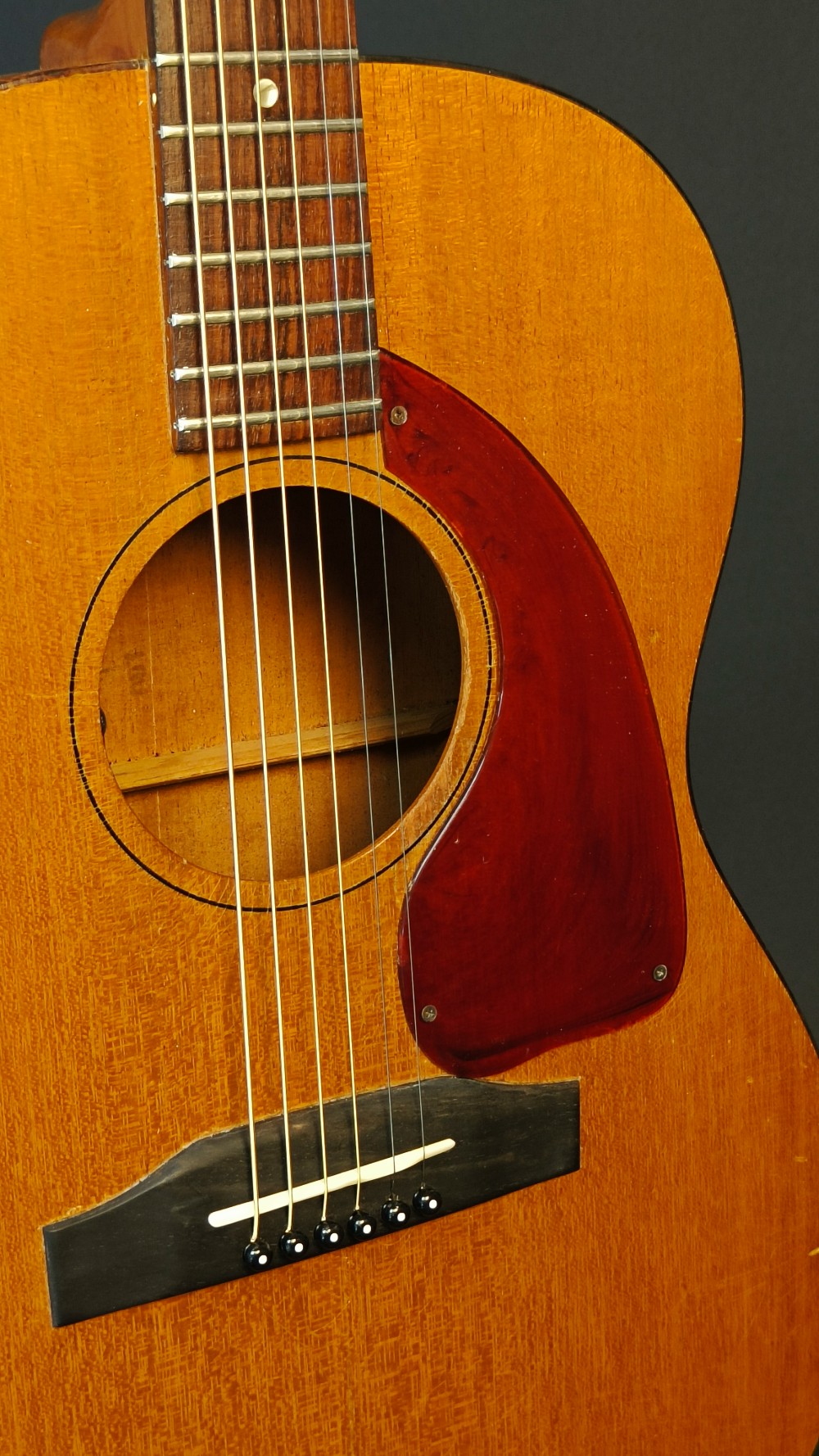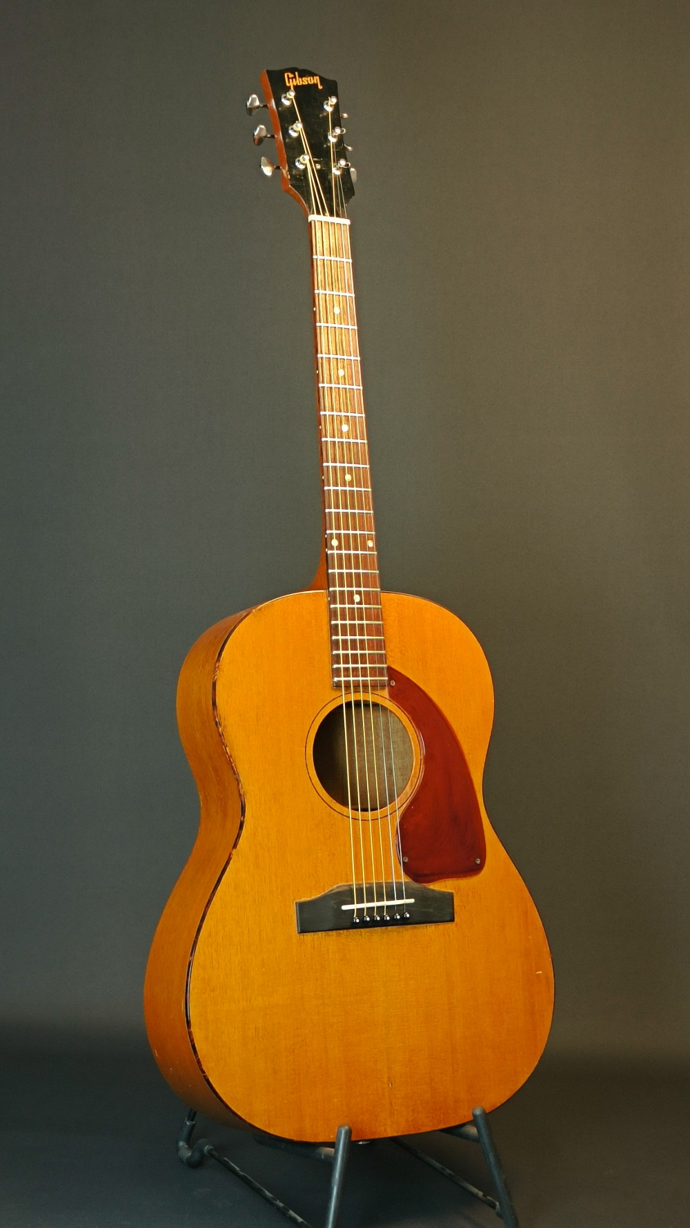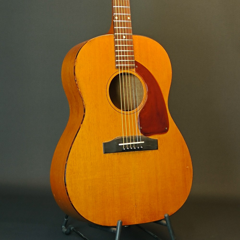 Gibson LG-0 – 1966 En välbehållen gitarr som har fått nytt stall i ebenholts. Modellen hade plaststall från början, vilka ofta gav med sig och blev deformerade med åren. Gitarren är utrustad med K&K Pure Mini mikrofonsystem och levereras i sin originalväska. Banden är tidigare omslipade och är i gott skick med endast lite slitage. Stämskruvarna är utbytta mot modernare Grover, men originalstämskruvarna följer med. Den har även fått ny intonerad stallsadel i ben och ny översadel i ben. Den är i väldigt trevlig skick, med många dings och repor, men ger ett stabilt och välfungerande intryck och känsla när man ser och spelar den. Halsen är smal, 40 mm vid översadeln och mensurlängden är 24,75″ – 628 mm.