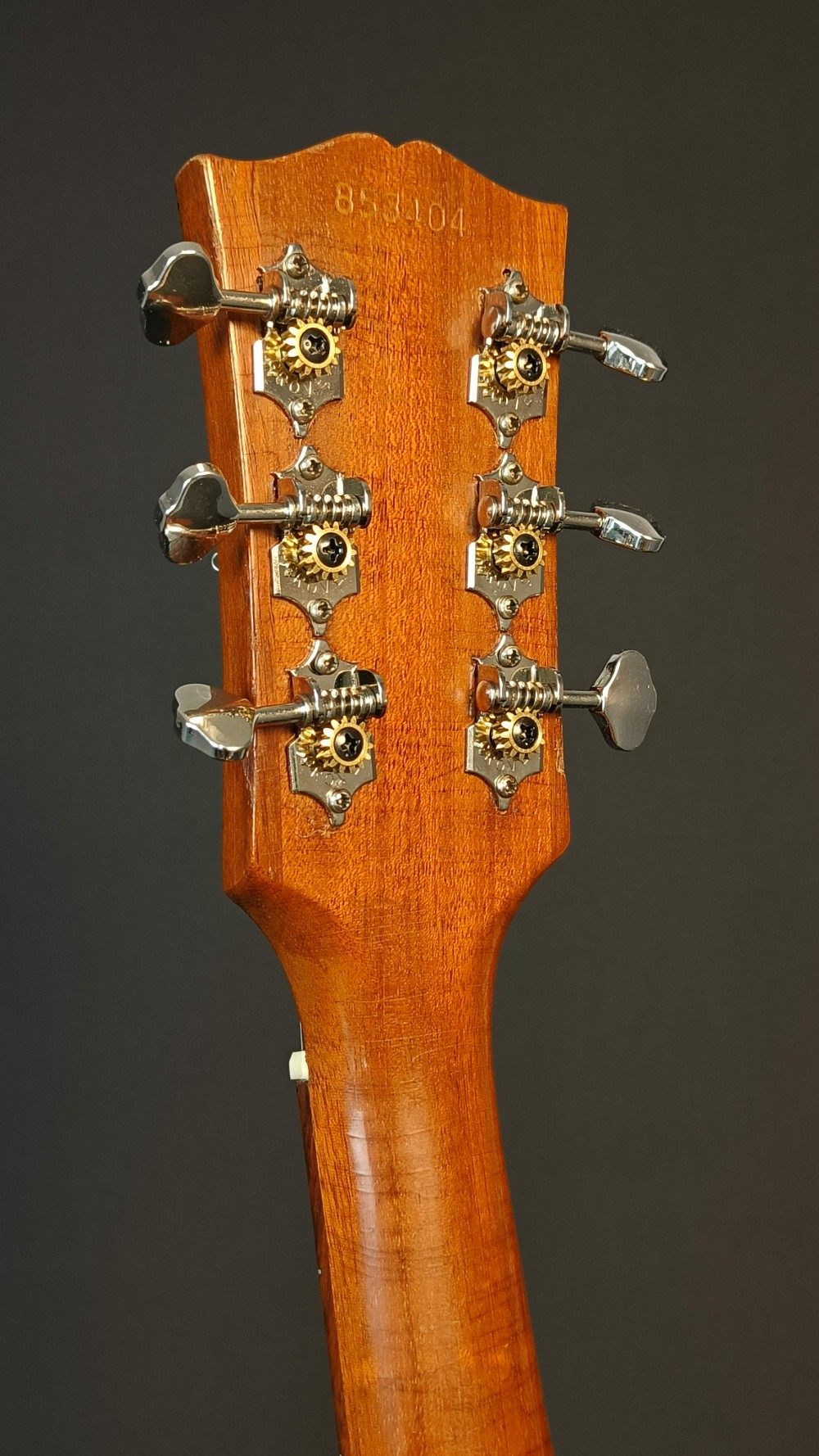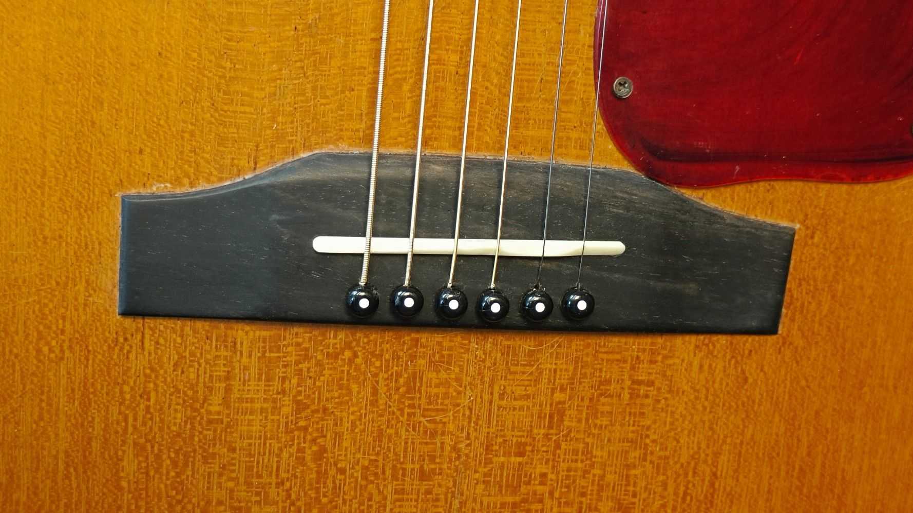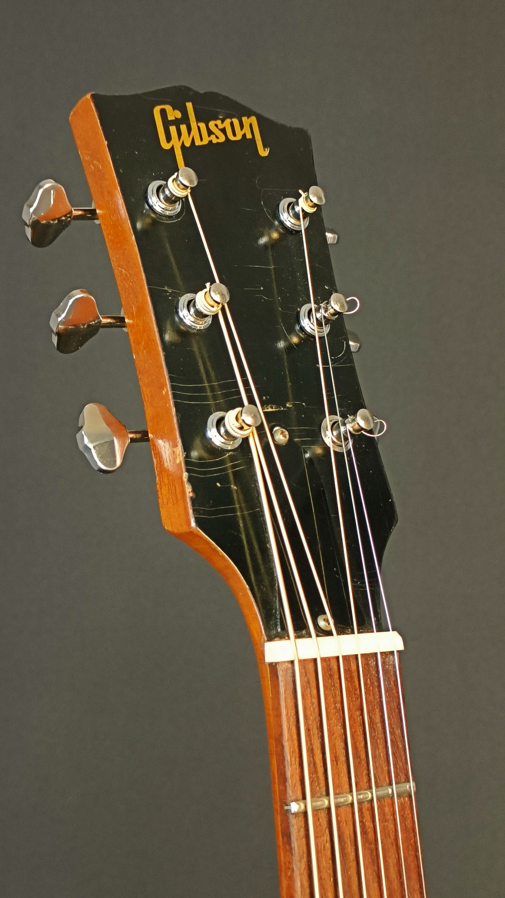 Gibson LG-0 – 1966 En välbehållen gitarr som har fått nytt stall i ebenholts. Modellen hade plaststall från början, vilka ofta gav med sig och blev deformerade med åren. Gitarren är utrustad med K&K Pure Mini mikrofonsystem och levereras i sin originalväska. Banden är tidigare omslipade och är i gott skick med endast lite slitage. Stämskruvarna är utbytta mot modernare Grover, men originalstämskruvarna följer med. Den har även fått ny intonerad stallsadel i ben och ny översadel i ben. Den är i väldigt trevlig skick, med många dings och repor, men ger ett stabilt och välfungerande intryck och känsla när man ser och spelar den. Halsen är smal, 40 mm vid översadeln och mensurlängden är 24,75″ – 628 mm.