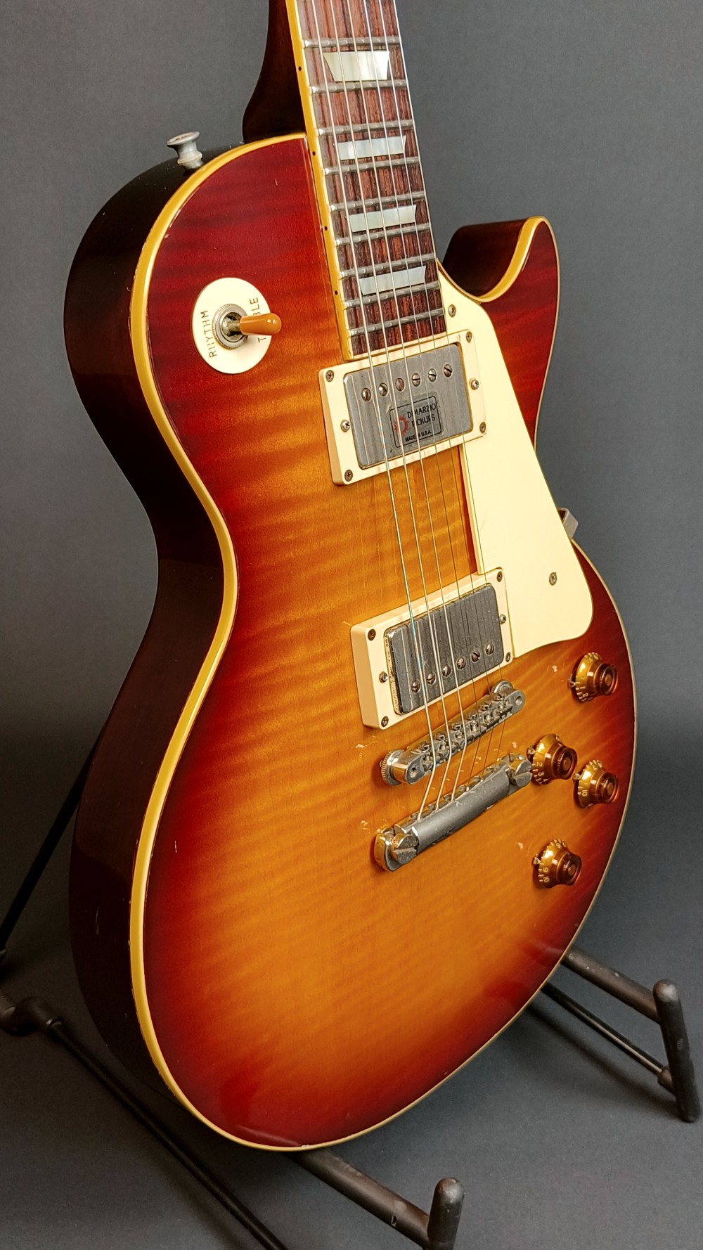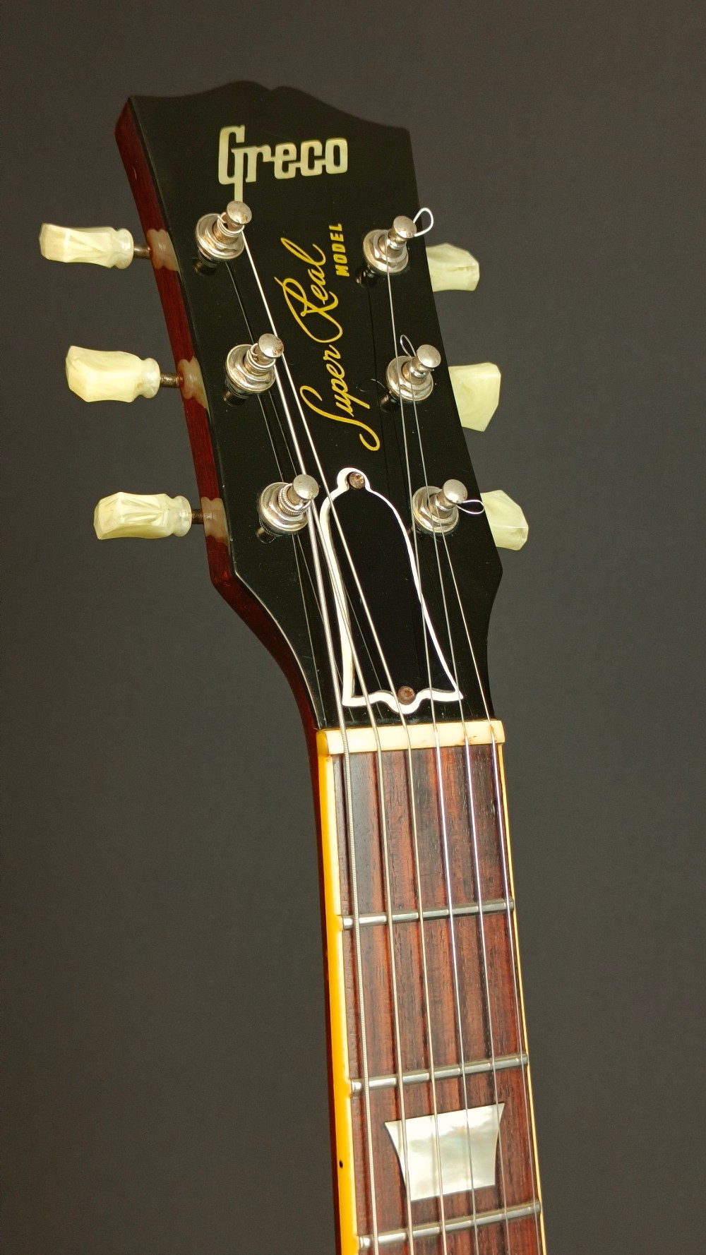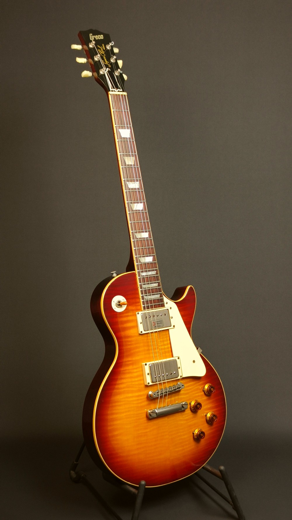 Greco EGF 1000 Super Real. En mycket bra Les Paul kopia med flametop, original DiMarzio PAF pickuper och ”fret edge binding”. Det här var en av de finaste Les Paulmodellerna tillverkade hos numera välkända Fuji Gen Gakki, mellan 1979 och 1982. Gitarren låter väldigt bra med PAF-karakteristiska humbuckers. Vi har justerat och polerat bandstavarna på den och strängat om den med Ernie Ball Slinky 010-046 strängar. Den väger 4080 gram och spelar väldigt bra, med bra höjd på bandstavarna. Gitarren har många små dings och lite repor på baksidan, men ger ett helt och fräscht intryck. Lacken ser ut som gammal nitrocellulosa, men vi tror inte att det är någon vanlig nitrolack, den har inte de vanliga krackeleringarna och de små skadorna ser inte heller riktigt ut som de brukar på traditionell nitrocellulosa. Olika källor påstår olika vad gäller nitrolack på high end Grecos, vi kan bara bekräfta att den har väldigt snygg lackering. Vi svarar gärna på alla frågor, och skickar fler bilder på detaljer om du önskar. Levereras i hårt etui, ej original.