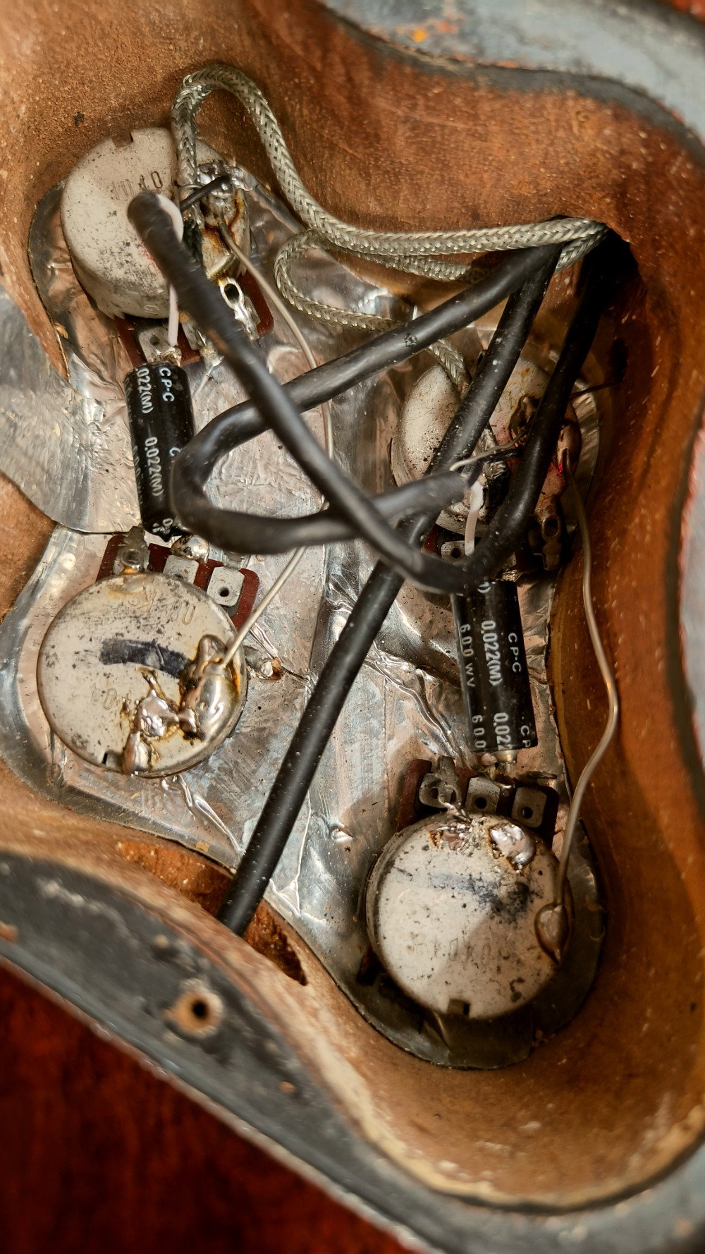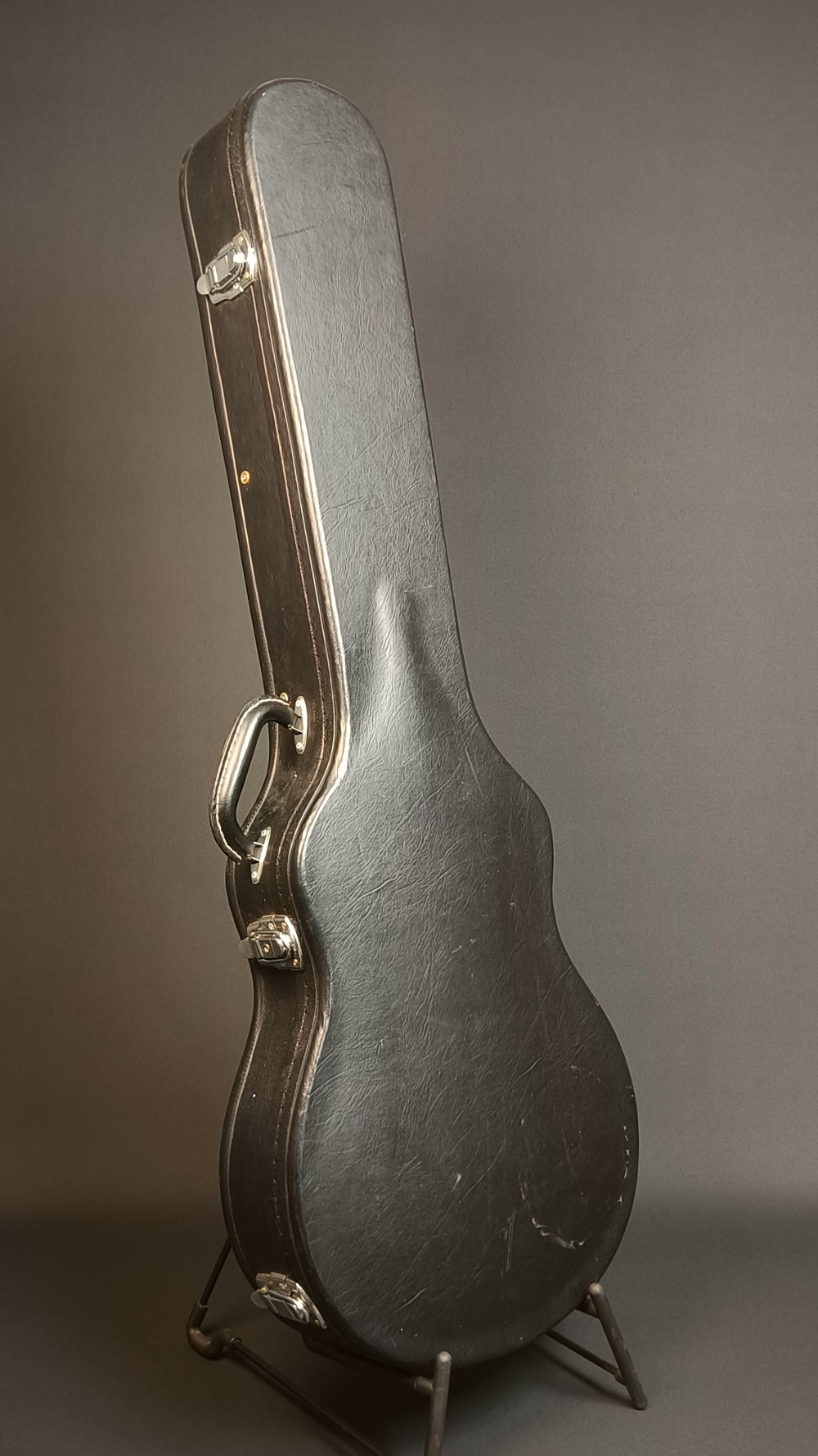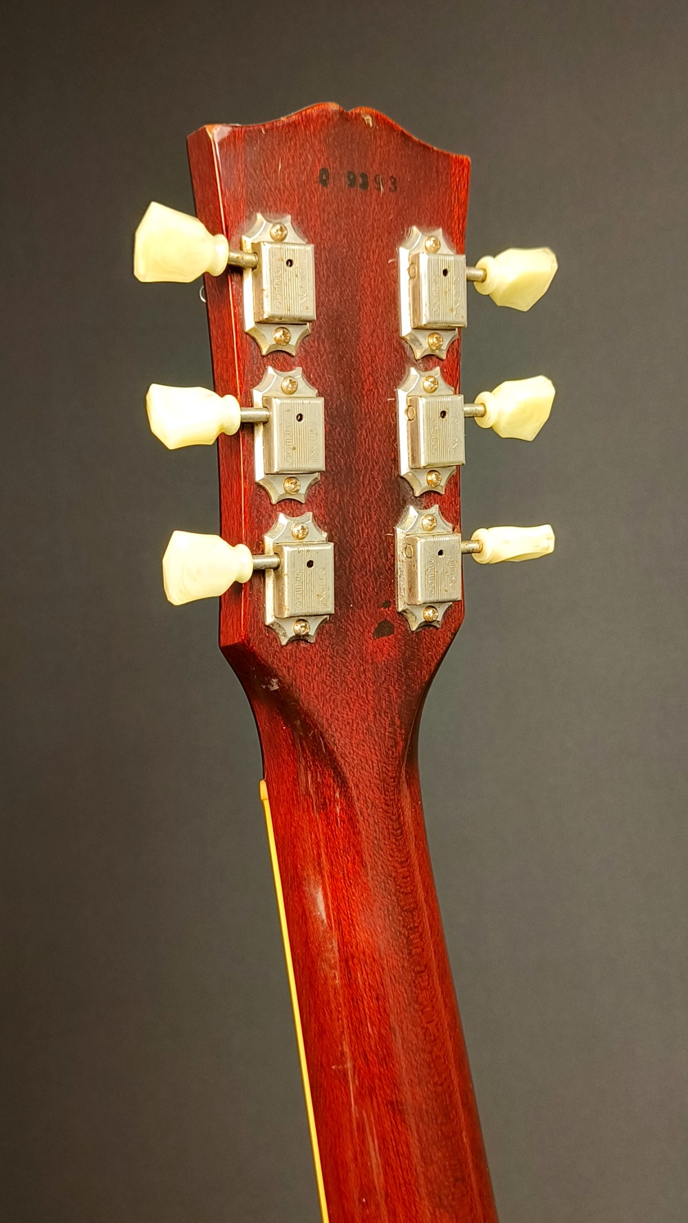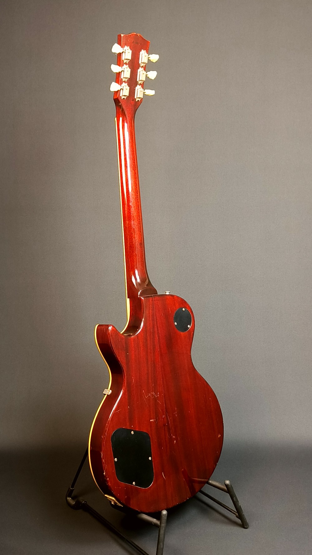 Greco EGF 1000 Super Real. En mycket bra Les Paul kopia med flametop, original DiMarzio PAF pickuper och ”fret edge binding”. Det här var en av de finaste Les Paulmodellerna tillverkade hos numera välkända Fuji Gen Gakki, mellan 1979 och 1982. Gitarren låter väldigt bra med PAF-karakteristiska humbuckers. Vi har justerat och polerat bandstavarna på den och strängat om den med Ernie Ball Slinky 010-046 strängar. Den väger 4080 gram och spelar väldigt bra, med bra höjd på bandstavarna. Gitarren har många små dings och lite repor på baksidan, men ger ett helt och fräscht intryck. Lacken ser ut som gammal nitrocellulosa, men vi tror inte att det är någon vanlig nitrolack, den har inte de vanliga krackeleringarna och de små skadorna ser inte heller riktigt ut som de brukar på traditionell nitrocellulosa. Olika källor påstår olika vad gäller nitrolack på high end Grecos, vi kan bara bekräfta att den har väldigt snygg lackering. Vi svarar gärna på alla frågor, och skickar fler bilder på detaljer om du önskar. Levereras i hårt etui, ej original.