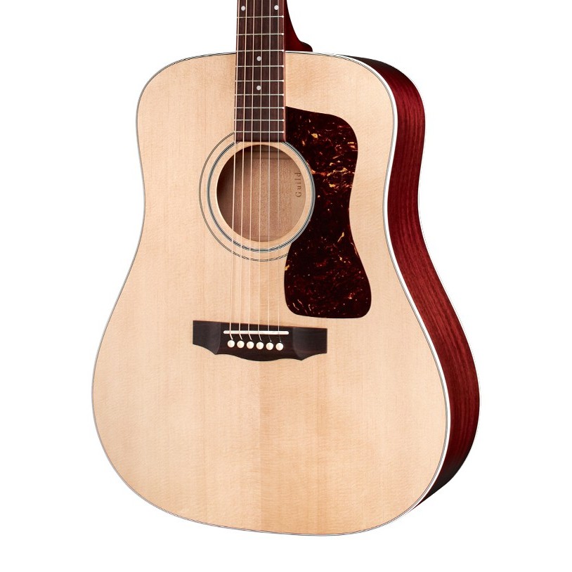Guild D-40 är den gamla välkända modellen från 1960-talet i ny finish. Har en sidenblank lyster med subtil elegans. Gitarren har sitkagran lock, mahogny hals, sidor och botten och rosewood stall och greppbräda. Scalloped bracing av Adirondack spruce och tortois plektrumskydd. Mycket varm, något spröd men väldigt tät klang med en stadig basregister. En välbyggd amerikansk gitarr med den rätta klangen. Levereras i hårt originaletui med inbyggd luftfuktare. Tillverkad i U.S.A.