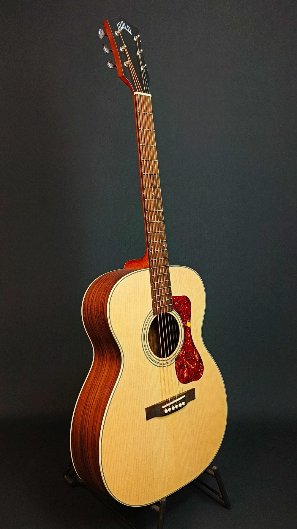Guild OM-250E är en Limited Edition archback gitarr, som har rosewood sidor och botten. Bakstycket är pressvälvt, vilket är en karakteristisk detalj på många Guildmodeller ända sedan 1960-talet. Det ger en fokuserad, rund basregister trots det lilla formatet. Sidenmattlackerad och utrustad med Fishman mikrofonsystem. Nu kan denna köpas för specialpris, den kostar en tusenlapp mer i vanligt fall.