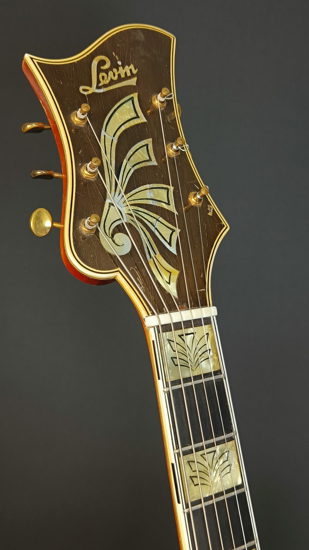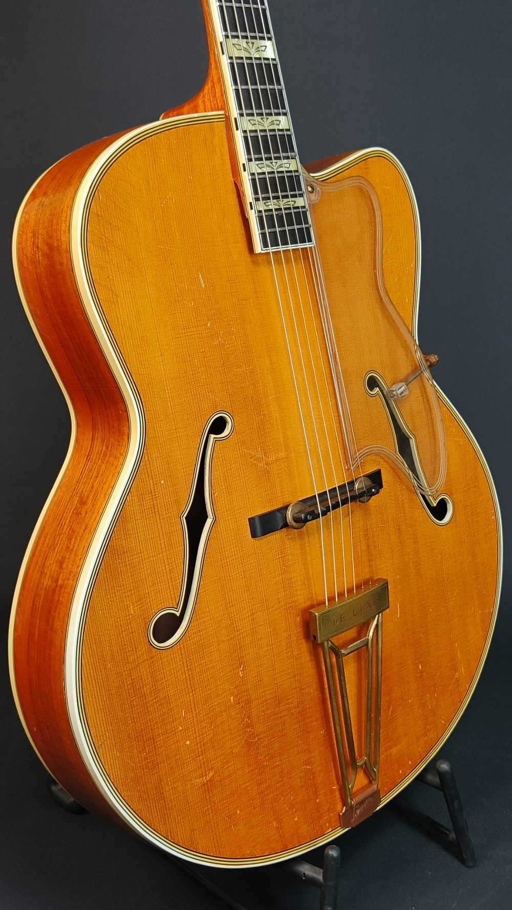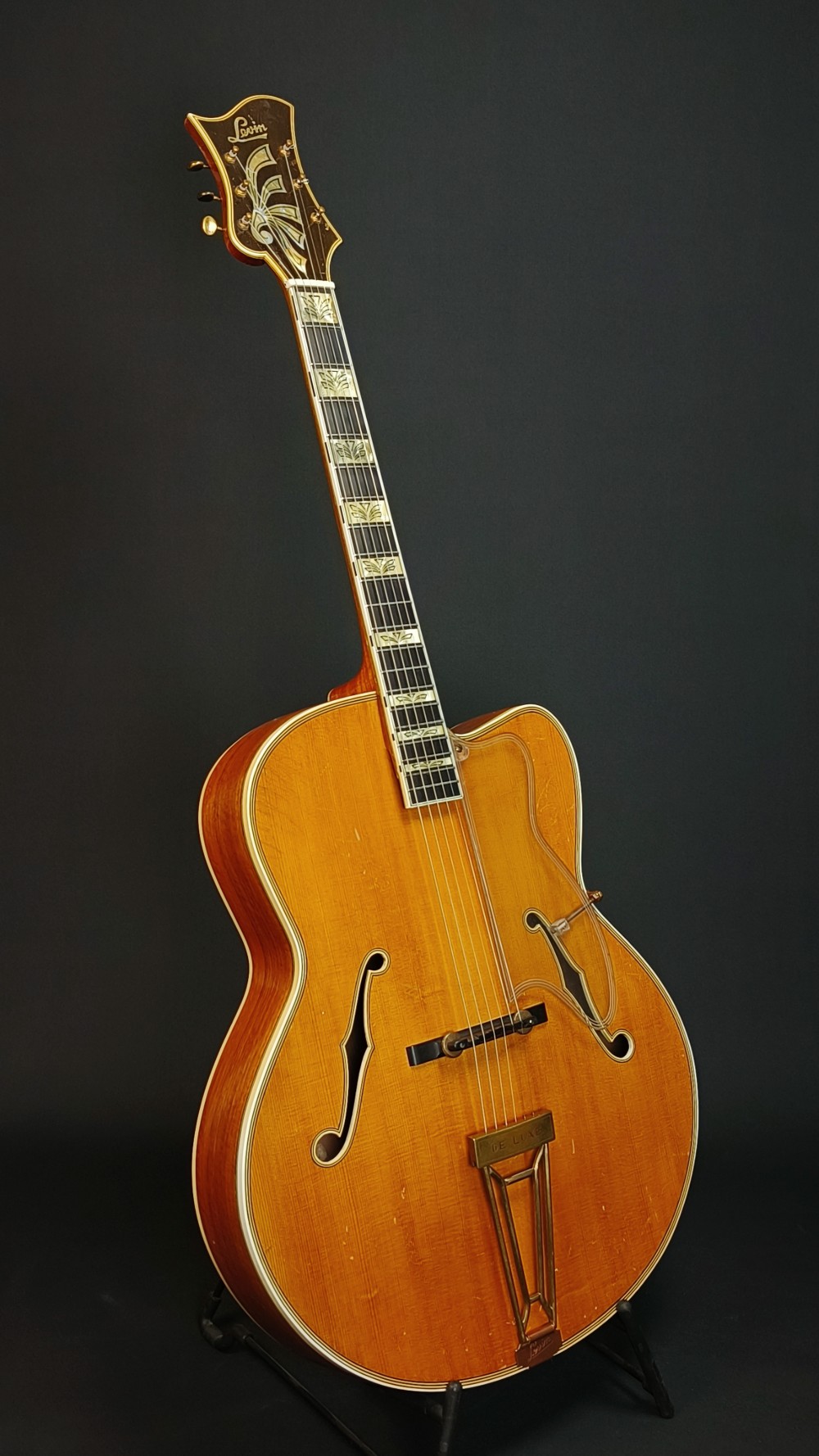Levin DeLuxe 1955 – Väldigt trevligt exemplar i fint originalskick. Den har nyare översadel i ben och plektrumskyddet är nog inte original, men allt annat är från 1955. Gitarren spelar och låter väldigt bra. Den har varit på Plekning för några år sedan hos Guitarlabs. Den har en liten spricka i halsen, som syns på bilden men mittförstärkningen är hel. Enligt dess senaste ägare, som har haft den i många år, har det varit så så länge han har ägt den. Det är helt stabilt och behöver ingen vidare åtgärd. Gitarren har aldrig haft pickuper, den är helt oskruvad och har ingen modifikation. Ett häftigt fint, blont exemplar med imponerande ljud från den 18″ breda kroppen. Lock i gran, sidor och botten i mycket fint valnöt, hals i mahogny med lönnförstärkning i mitten. Levereras i hårt originaletui(!) med Humitron Luftfuktare.