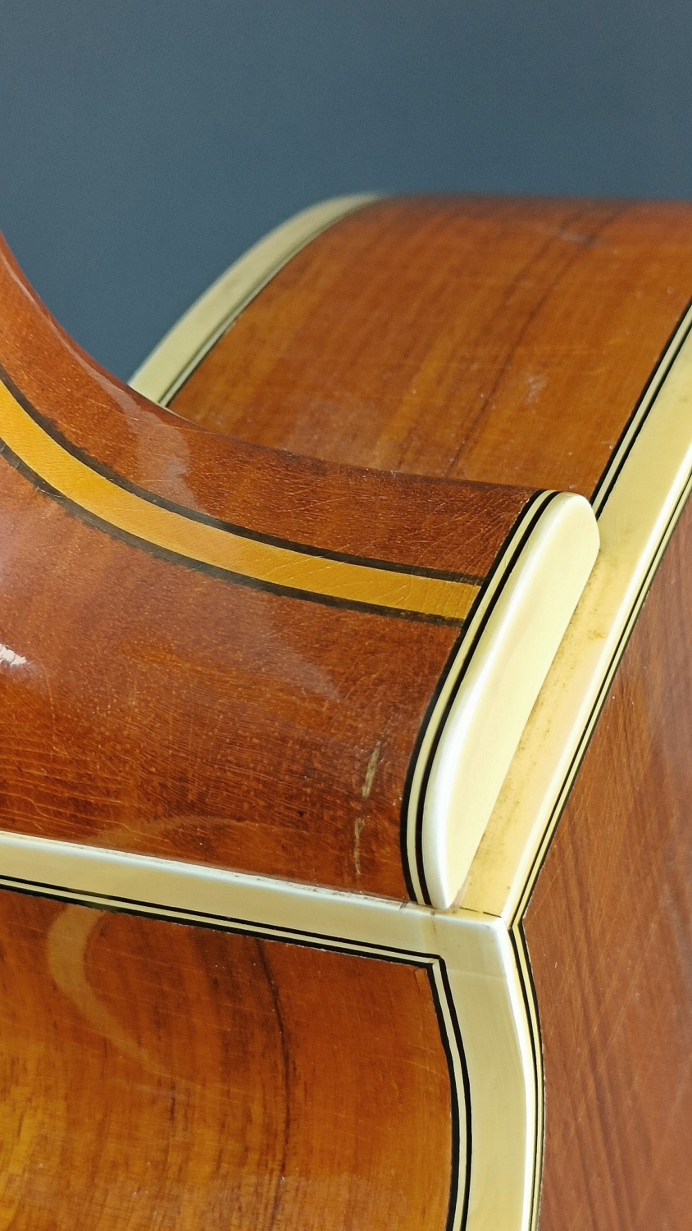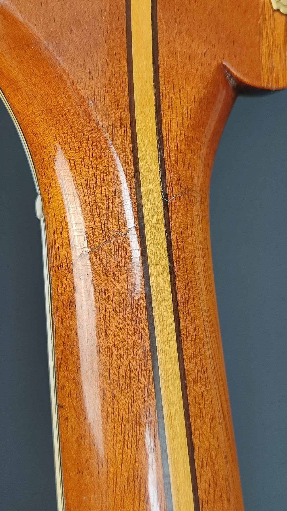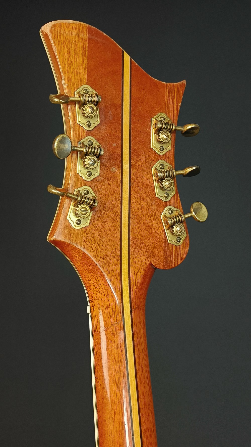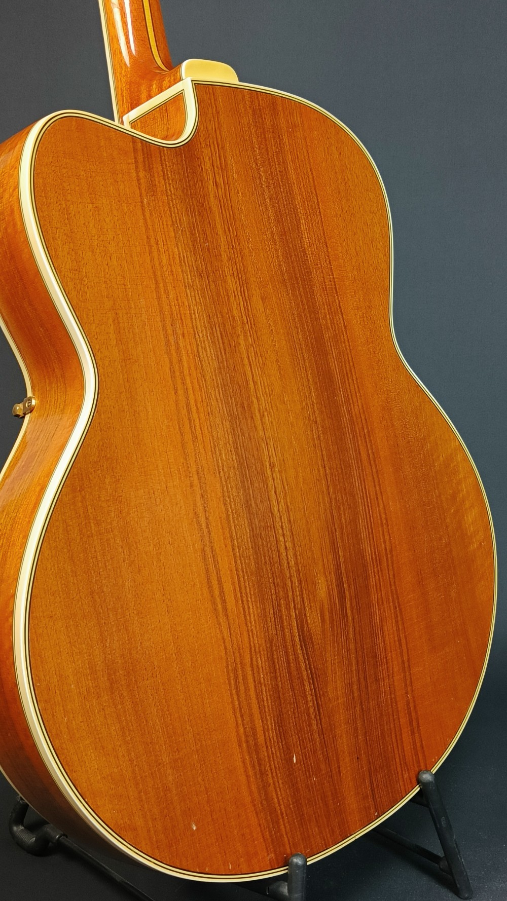 Levin DeLuxe 1955 – Väldigt trevligt exemplar i fint originalskick. Den har nyare översadel i ben och plektrumskyddet är nog inte original, men allt annat är från 1955. Gitarren spelar och låter väldigt bra. Den har varit på Plekning för några år sedan hos Guitarlabs. Den har en liten spricka i halsen, som syns på bilden men mittförstärkningen är hel. Enligt dess senaste ägare, som har haft den i många år, har det varit så så länge han har ägt den. Det är helt stabilt och behöver ingen vidare åtgärd. Gitarren har aldrig haft pickuper, den är helt oskruvad och har ingen modifikation. Ett häftigt fint, blont exemplar med imponerande ljud från den 18″ breda kroppen. Lock i gran, sidor och botten i mycket fint valnöt, hals i mahogny med lönnförstärkning i mitten. Levereras i hårt originaletui(!) med Humitron Luftfuktare.