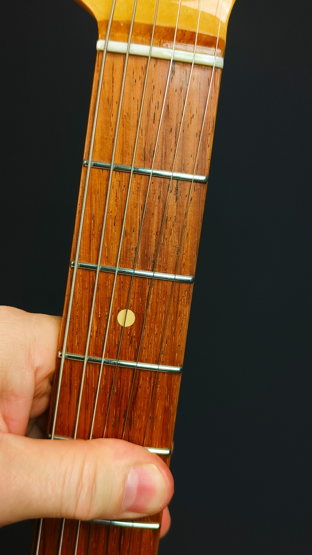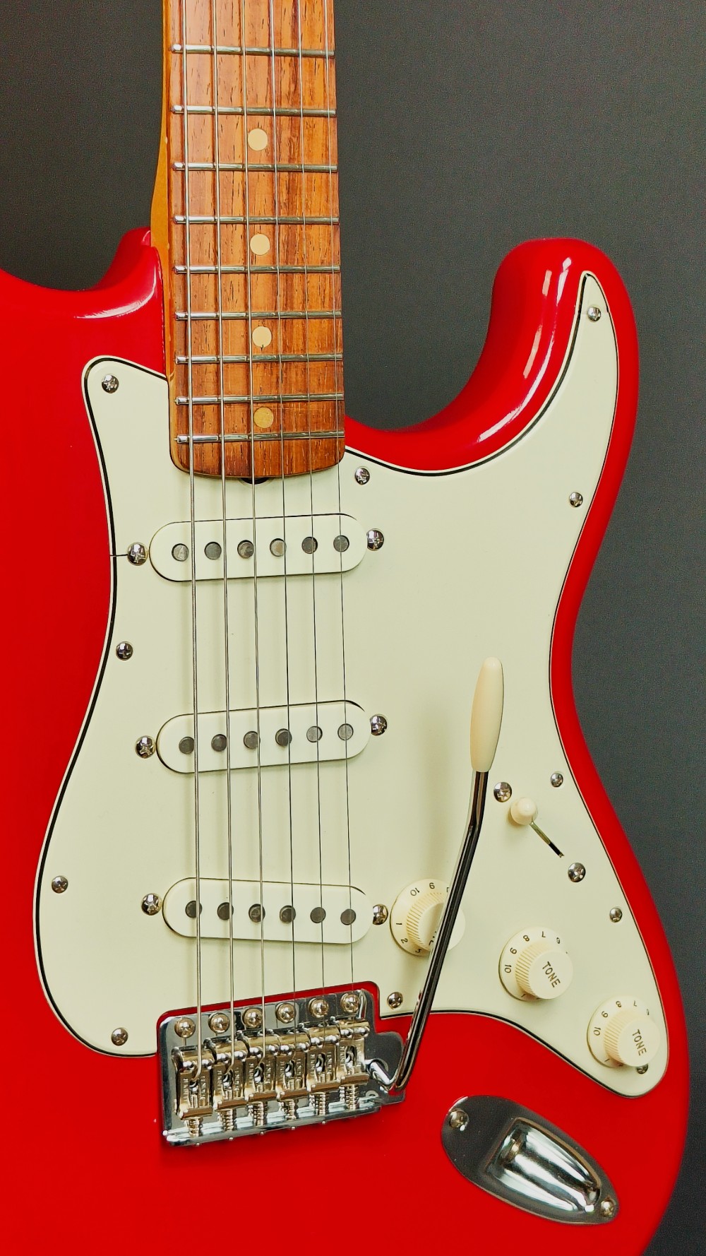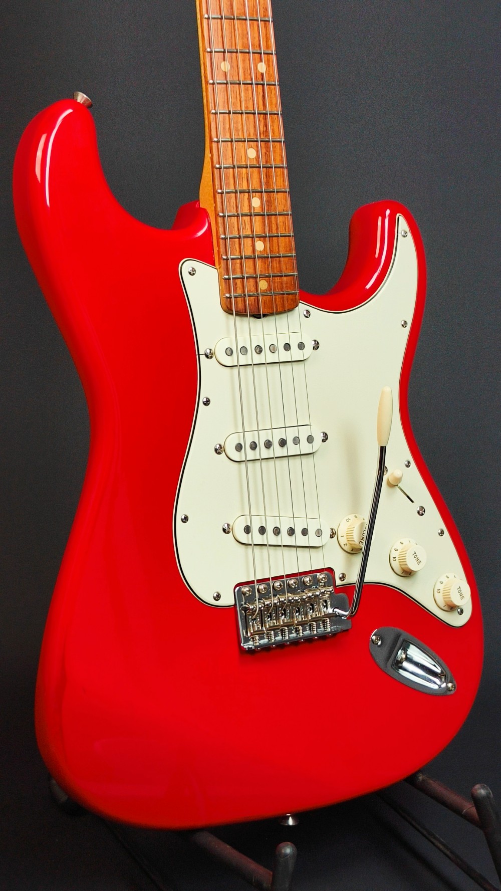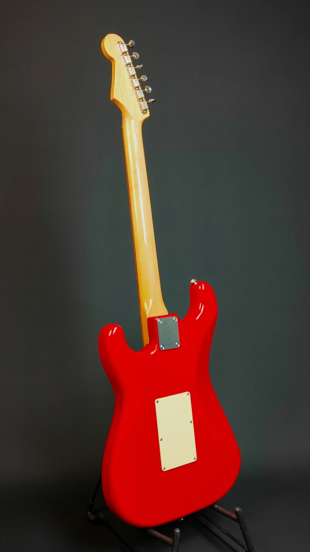 Dakota Red Stratocaster av hög kvalitet. Dess hals är en nitrocellulosalackerad Musikraft med vintage specar och en lite tjockare C-profil (23 mm vid 1:a och 26 mm vid 12:e band). Den har Gotoh SD-90 stämskruvar, medium breda och höga, ca 1,3 mm bandstavar. Greppbrädan ser ut att vara Madagascar rosewood som har bleknat något med tiden. Hela halsen verkar vara lite äldre, vi gissar runt 20 år. Kroppen är Nitrocellulosalackad Dakotaröd al, från Hosco. Något repig och nött, men snygg. Stallet är nytt, Fender original vintage med stålblock. Elektroniken är också helt ny, bestående av Fender TexMex pickuper, CTS potentiometrar och paper in oil kondensator. Plektrumskyddet är från WD och rattarna och pickupkåporna är Fender original. Gitarren väger 3470 gram med svajarm och låter stadigt, mjukt och varmt med lång klang. En Strata med fin känsla och hög kvalitet.