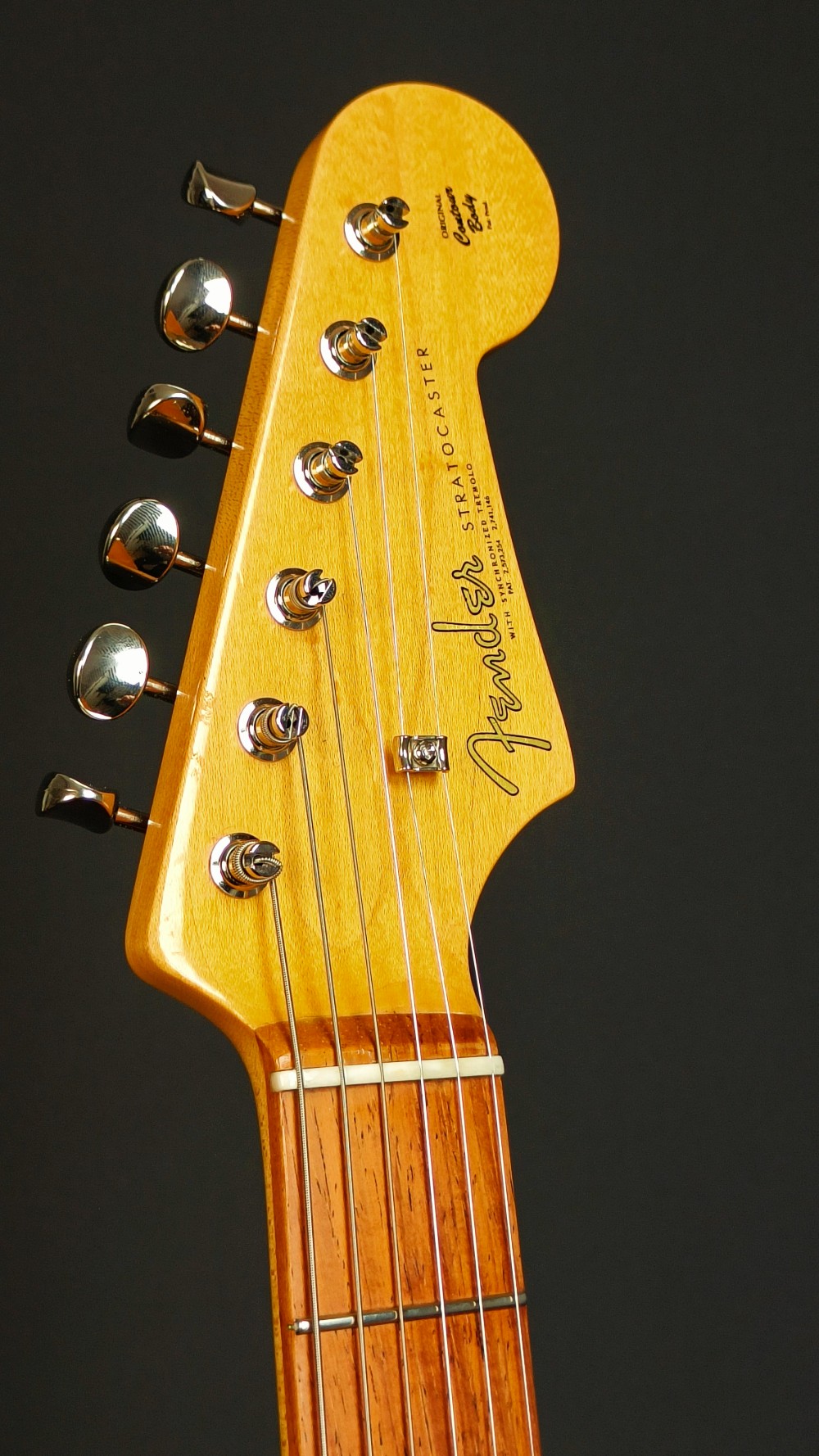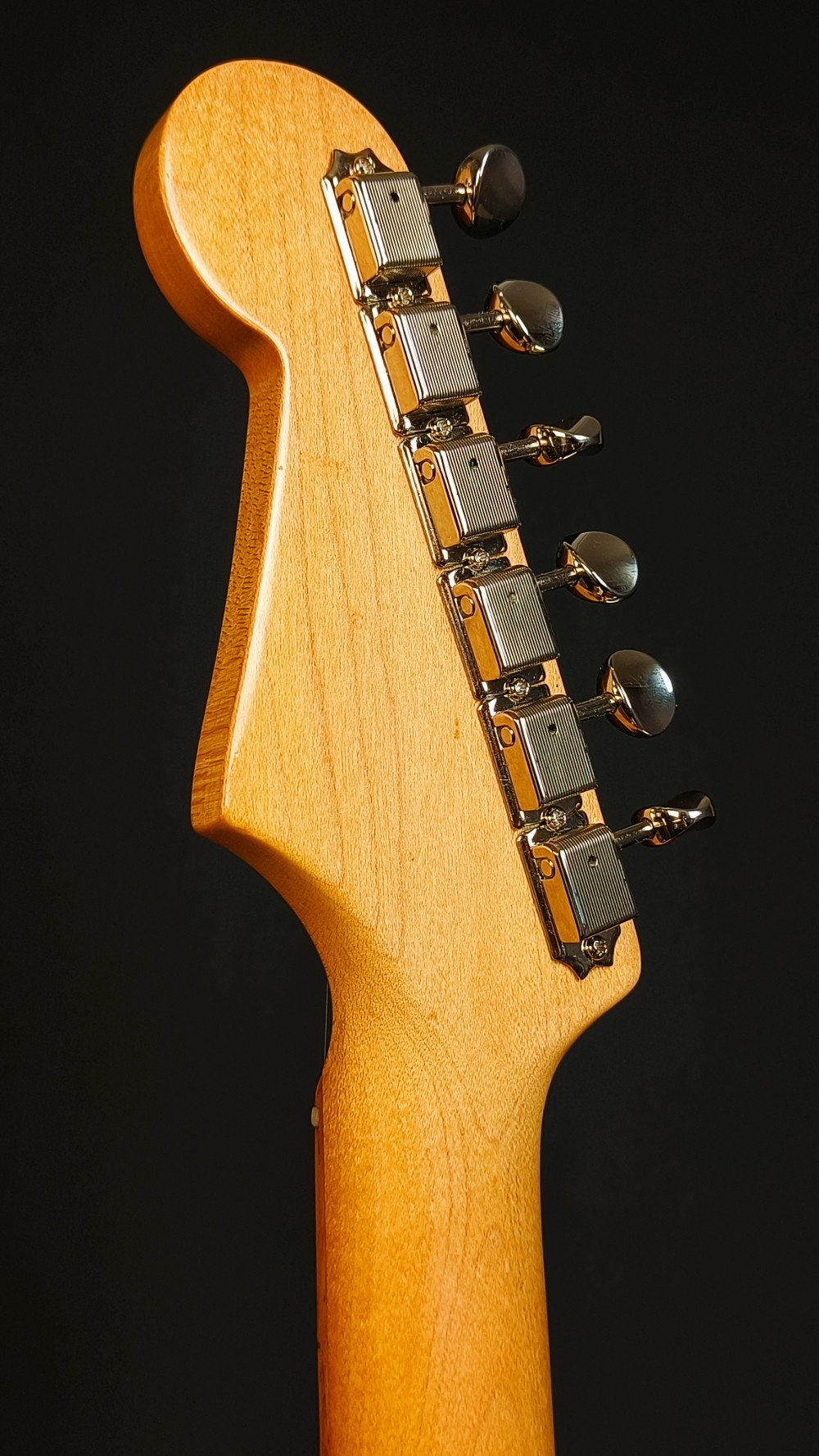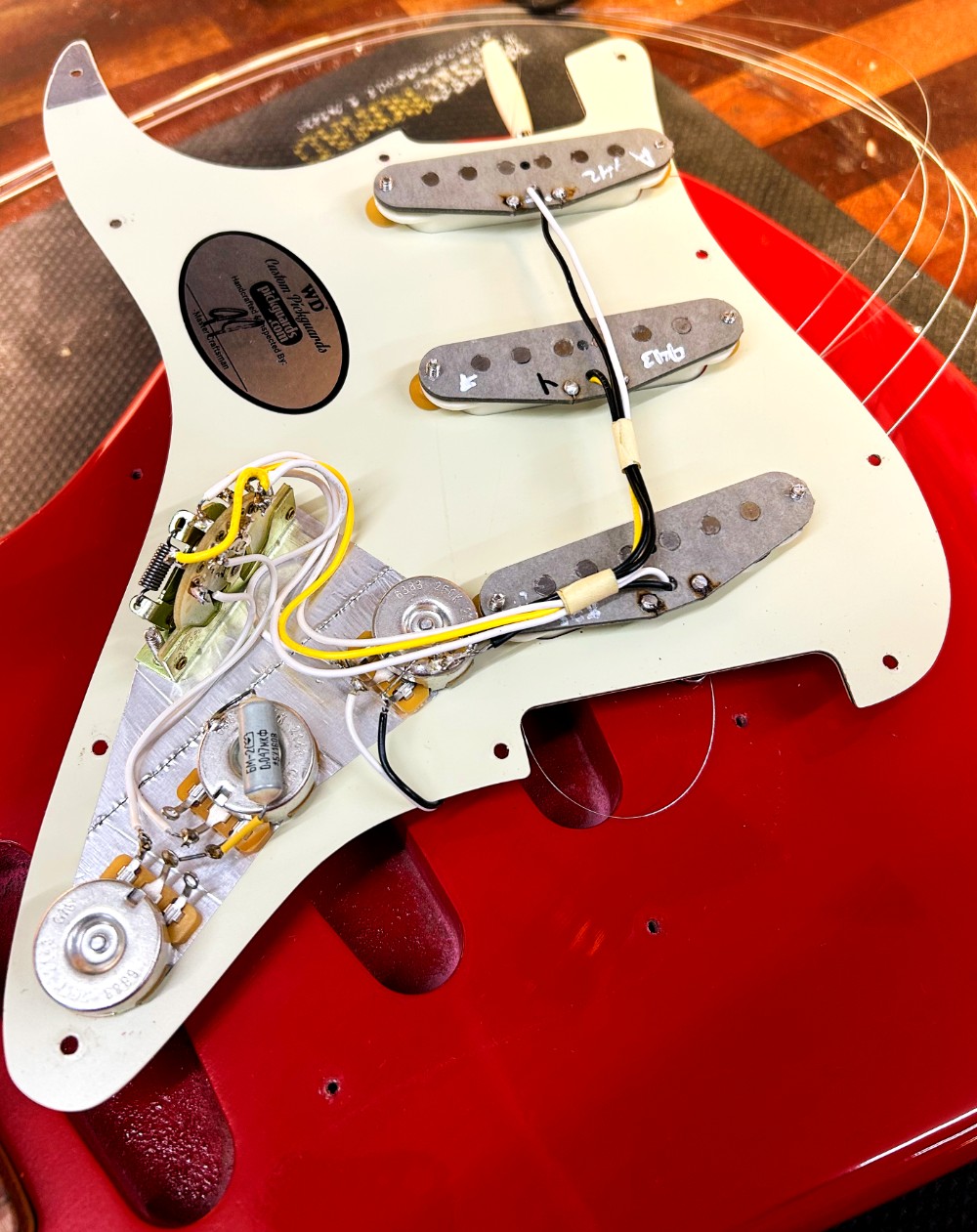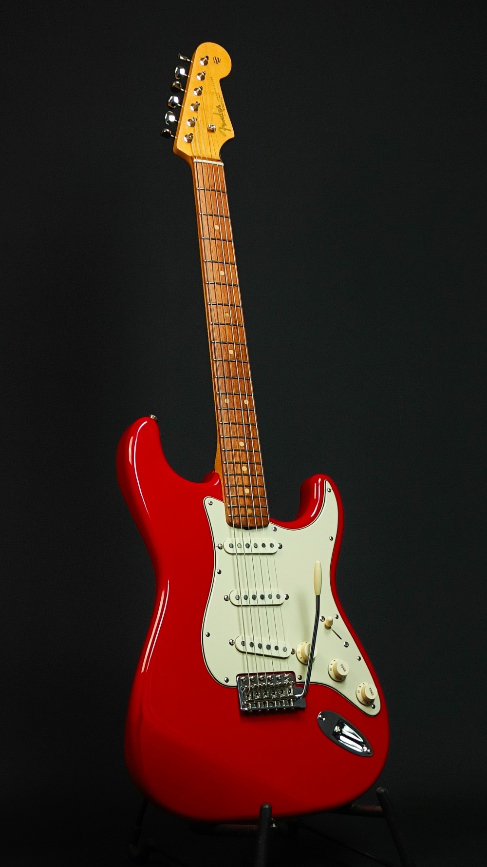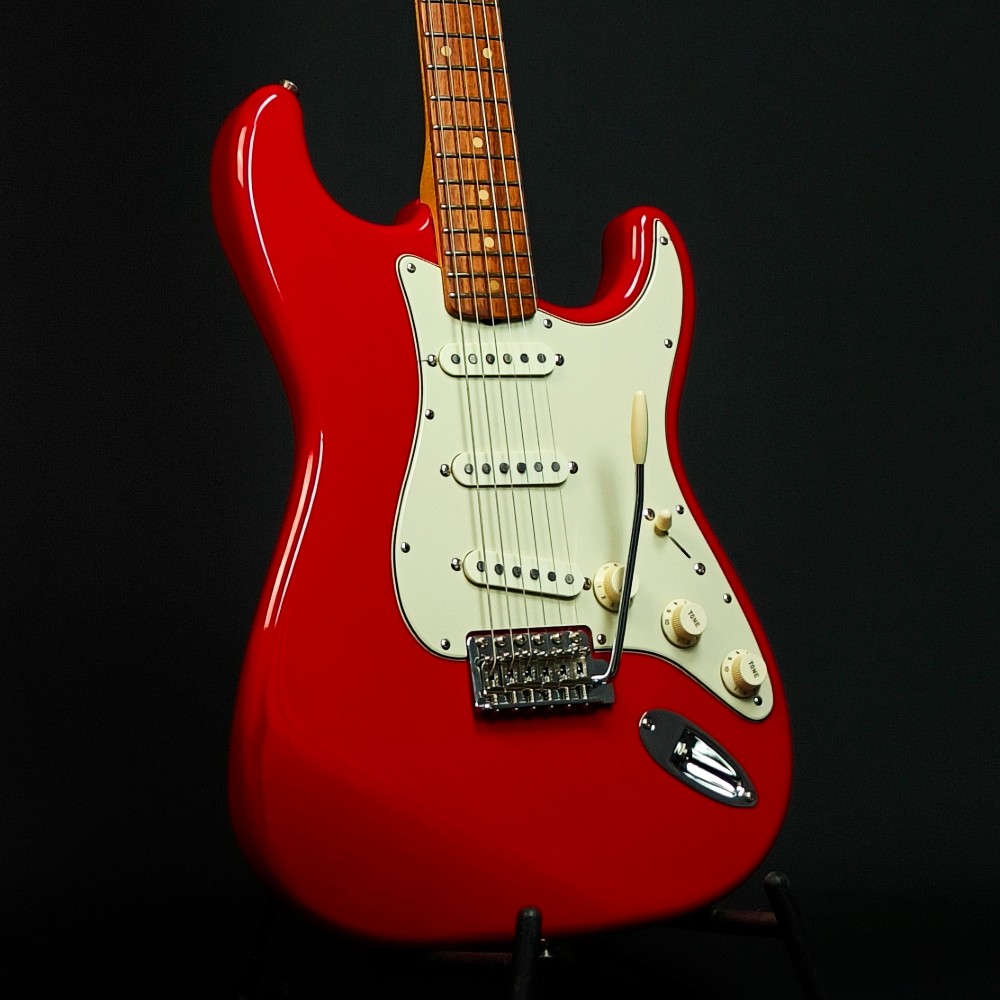 Dakota Red Stratocaster av hög kvalitet. Dess hals är en nitrocellulosalackerad Musikraft med vintage specar och en lite tjockare C-profil (23 mm vid 1:a och 26 mm vid 12:e band). Den har Gotoh SD-90 stämskruvar, medium breda och höga, ca 1,3 mm bandstavar. Greppbrädan ser ut att vara Madagascar rosewood som har bleknat något med tiden. Hela halsen verkar vara lite äldre, vi gissar runt 20 år. Kroppen är Nitrocellulosalackad Dakotaröd al, från Hosco. Något repig och nött, men snygg. Stallet är nytt, Fender original vintage med stålblock. Elektroniken är också helt ny, bestående av Fender TexMex pickuper, CTS potentiometrar och paper in oil kondensator. Plektrumskyddet är från WD och rattarna och pickupkåporna är Fender original. Gitarren väger 3470 gram med svajarm och låter stadigt, mjukt och varmt med lång klang. En Strata med fin känsla och hög kvalitet.