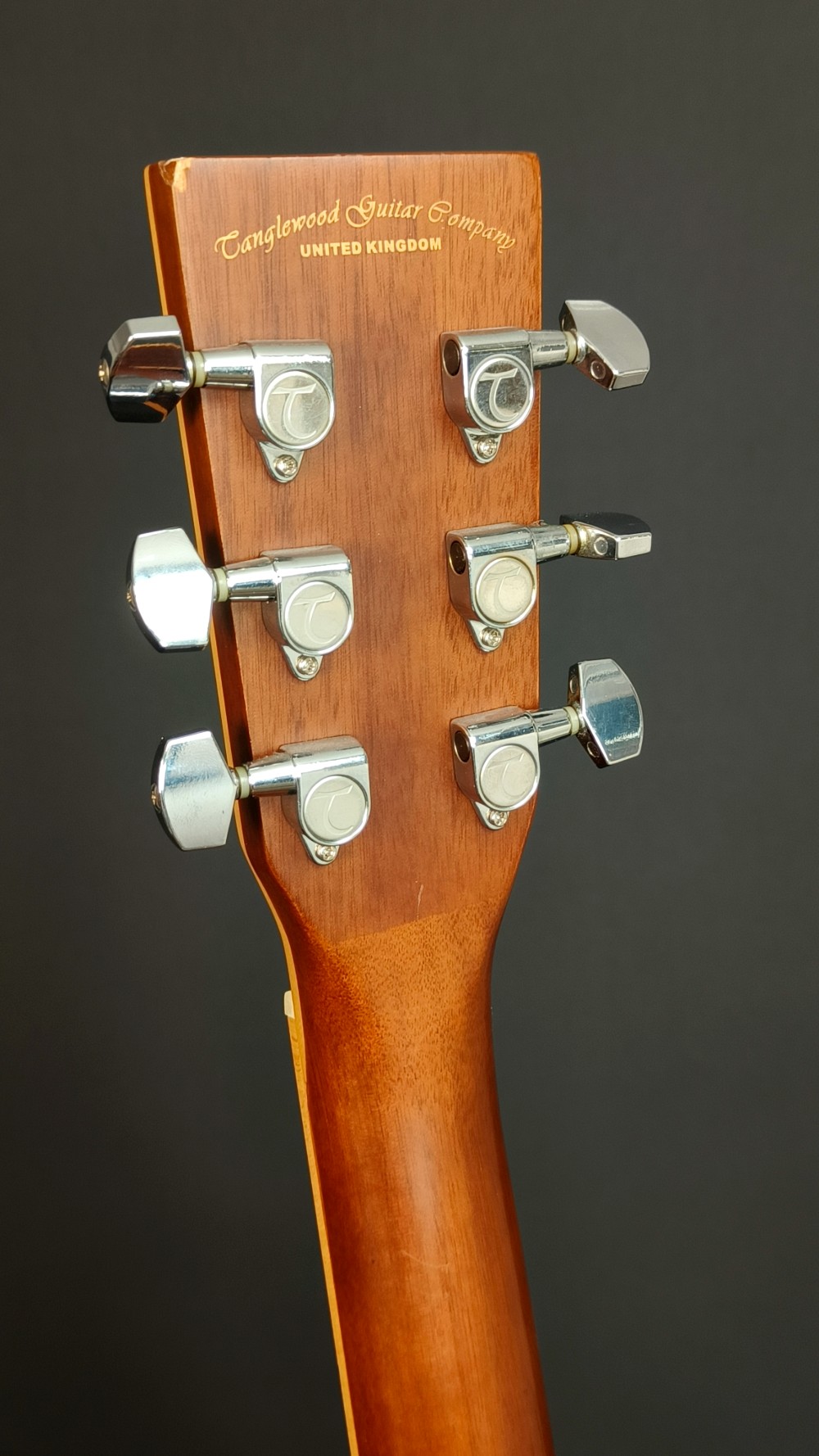 Tanglewood Evolution TW-28 CSN CE med solitt cederlock och Fishman mikrofonsystem, tillverkad 2012. Gitarren har lite slitage, stötmärken och repor, men är lättspelad, låter bra och ser trevlig ut i sin helhet. Nypriset var ca 5500 kronor i Sverige. Vi har strängat den med Ernia Ball Earthwood strängar, 80/20 bronze, 012-054.  Mycket ljud för pengarna!