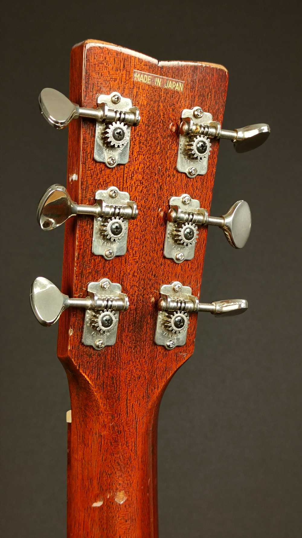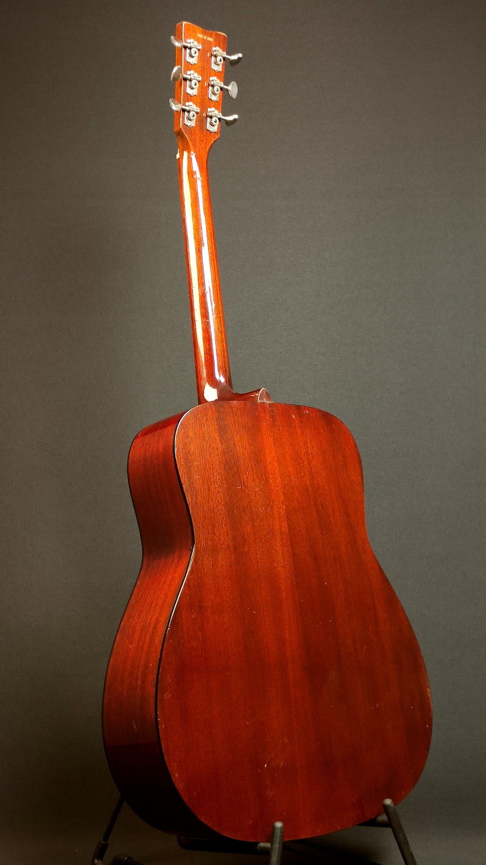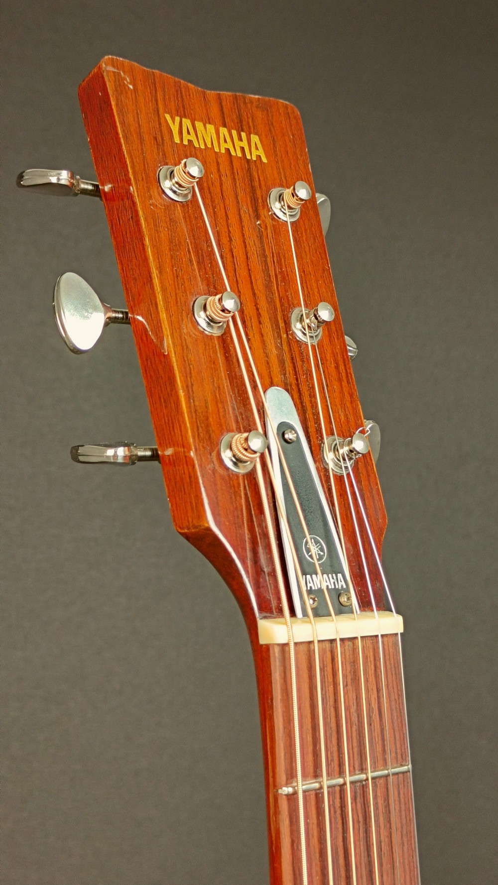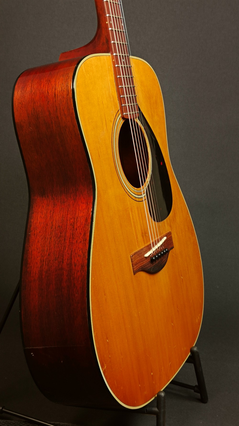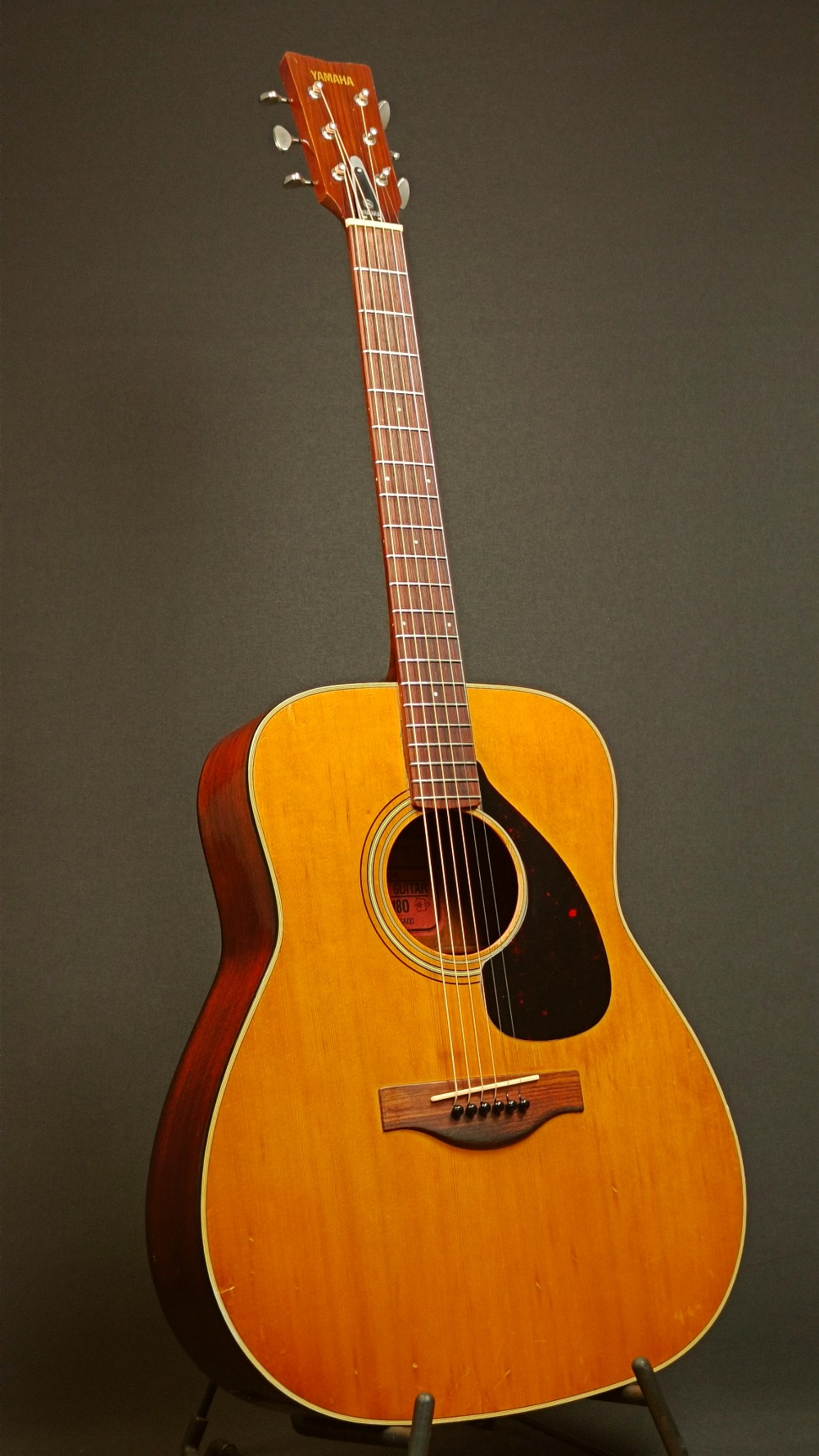 Yamaha FG-180 – Red Label – så kallas de första stålsträngade gitarrerna som Yamaha tillverkade med början 1966, då de hade en röd etikett i ljudhålet. De är mycket fina instrument, trots att de är byggda i laminerat virke. De låter briljant, med värme och fyllighet samtidigt som de är väldigt smidiga att spela. Att byggkvaliteten var hög på dem från början visas tydligt av att så många som klarade sig bra genom åren. Vårt exemplar från 1970 är nu renoverad med nyligen omsatt hals, sk Neck Reset, där man återställer halsens vinkel mot kroppen efter att alla år av strängtryck har fått gitarren att bågna ihop lite. Det är ödet av mer eller mindre alla stålsträngade gitarrer, så man kan säga att det är standardprocedur på gamla instrument. Vi har även bytt ut bandstavarna och försett gitarren med intonerade sadlar i äkta, oblekt ben. Originalsadlarna följer med. Gitarren spelar, låter och stämmer som en dröm, den har kort mensur och ganska tunn hals. Ljudet är lättdrivet, skimrande och fylligt, med luftig briljans. Den har en hel del små repor och tryckmärken efter 55 år av spelande, som ger fin patina och sköna vibbar. Strukturellt är gitarren rak, hel och frisk. Stämskruvar och dragstång är original och fungerar mjukt som smör och gitarren stämmer mycket fint. 25″ (635 mm) mensur och 44 mm halsbredd. Ett fantastiskt instrument på alla sätt, måste upplevas.