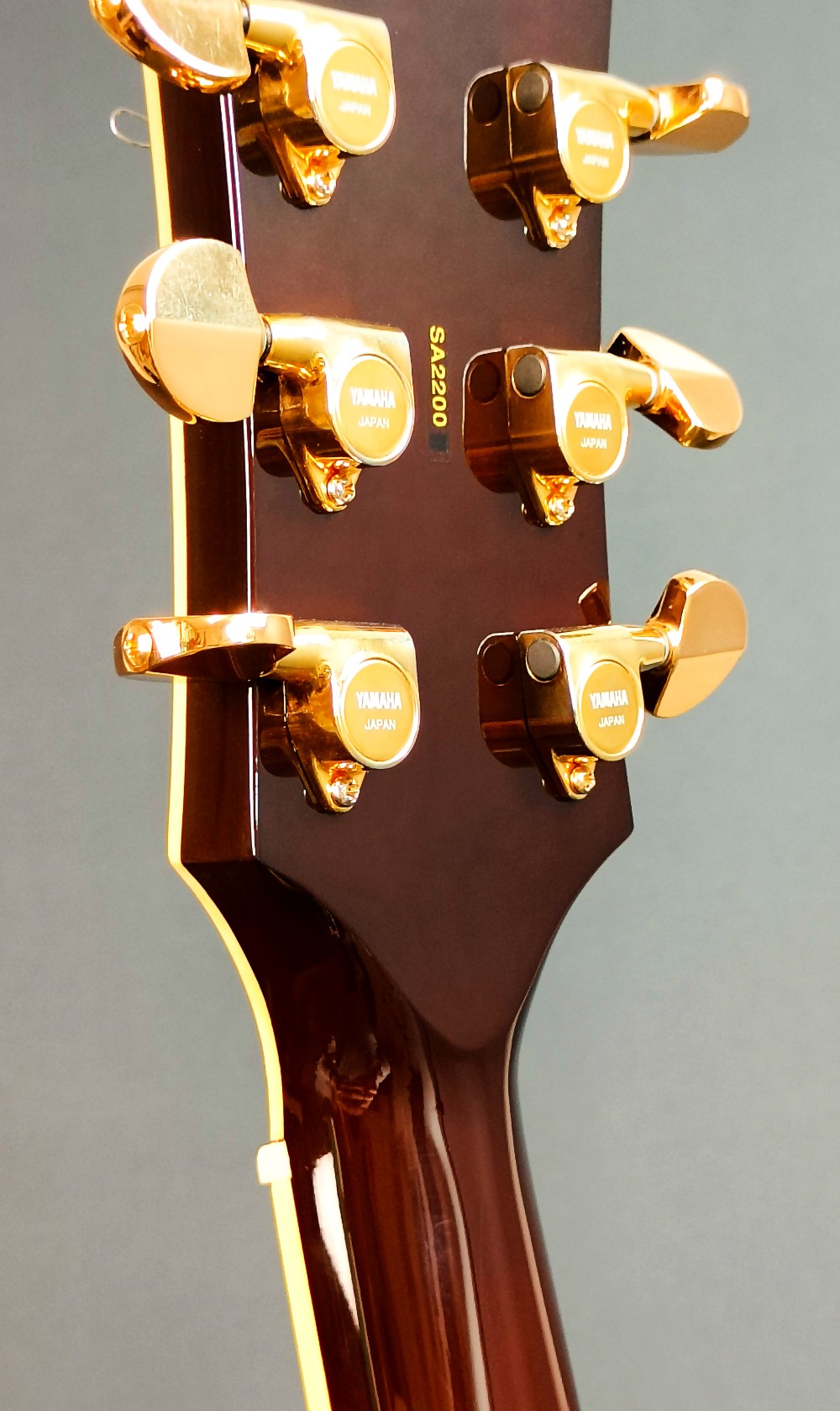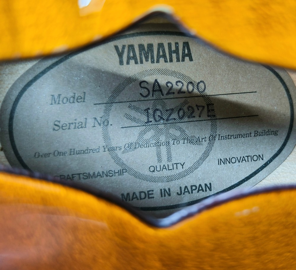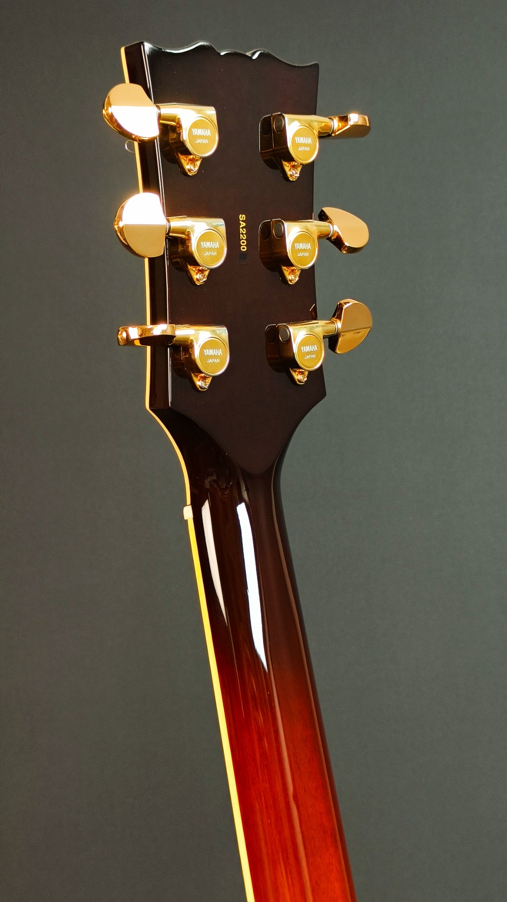 Yamaha SA2200 är byggd i Japan, en Gibson ES-335 kopia av imponerande kvalitet. Både klangen, spelkänslan och byggkvaliteten är av världsklass, jämförbart med de allra bästa. Vårt exemplar är i toppskick, ser nästan ny ut. Vi har reparerat dess spräckta huvud för 4 år sedan, men denna reparation går inte att se. Gitarren är i stort sett som ny, det finns inga spår av användning. Nypriset ligger runt 26.000:-.  Den måste upplevas, du kommer inte bli besviken.